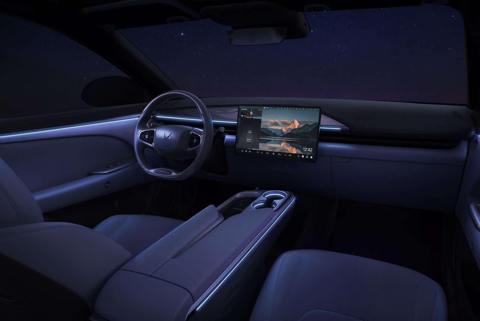 - التصميم: تتميز المقصورة بتصميم بسيط و عملي يخلو من لوحة العدادات التقليدية أمام السائق، حيث تتركز جميع المعلومات على الشاشة المركزية.