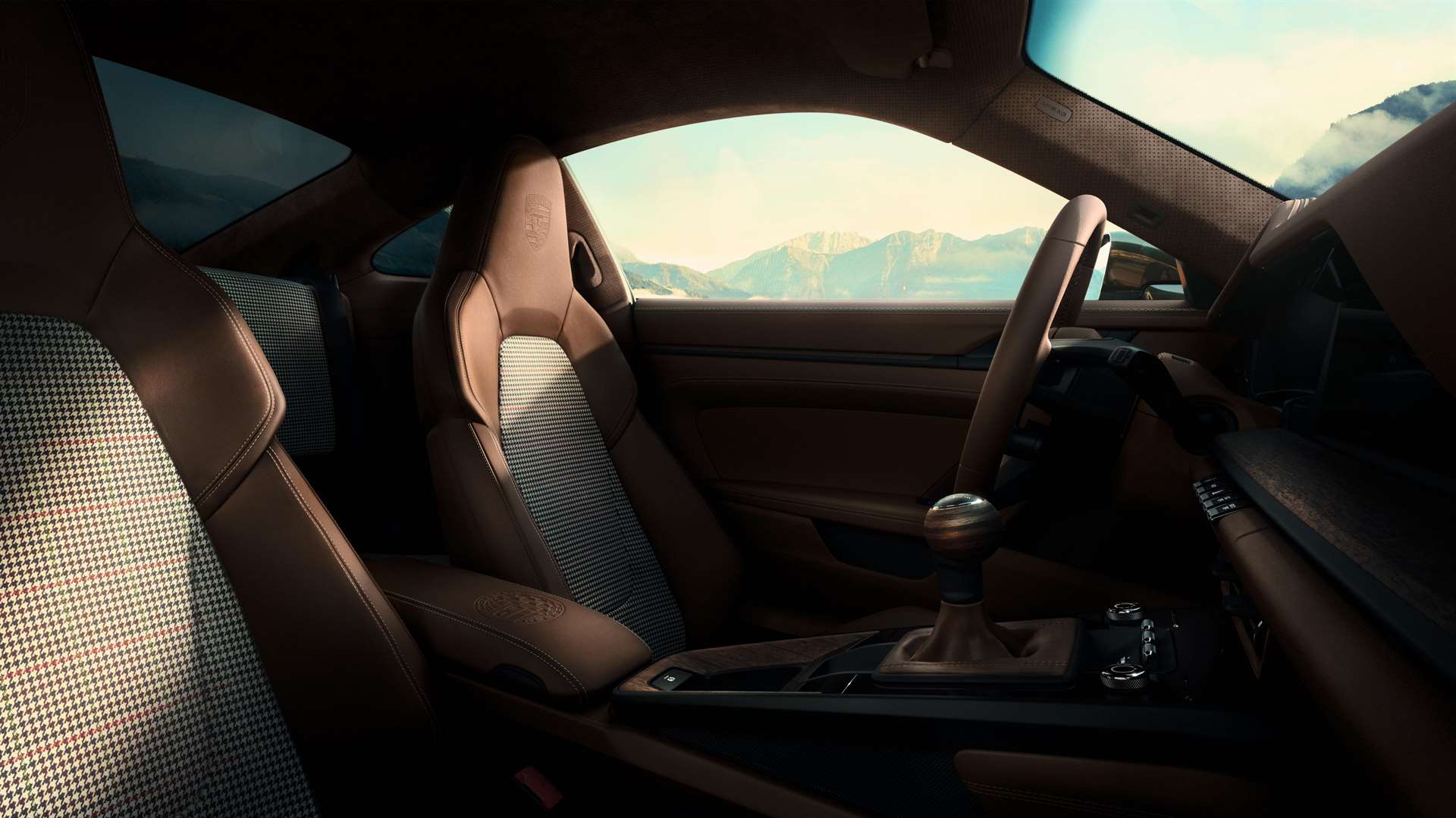 - المقاعد مغطاة بجلد Truffle Brown الفاخر مع قماش F.A. Grid-Weave المميز