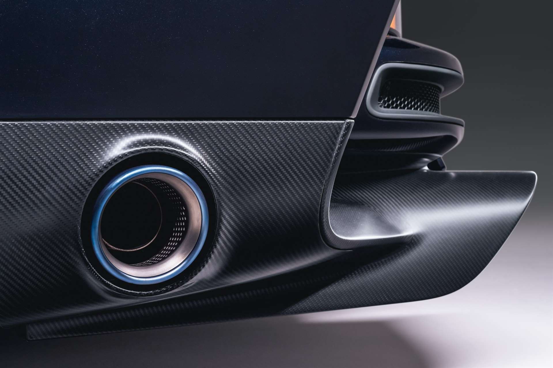 أما اللون الخارجي فهو فانتازيا أزرق (Fantasia Blue) بدرجات أغمق نحو الخلف، مع لمسات من الكربون المطفي في الأسفل و تفاصيل سوداء مؤكسدة في الأعلى، مما يمنح السيارة طابعاً فنياً عميقاً و فاخراً.