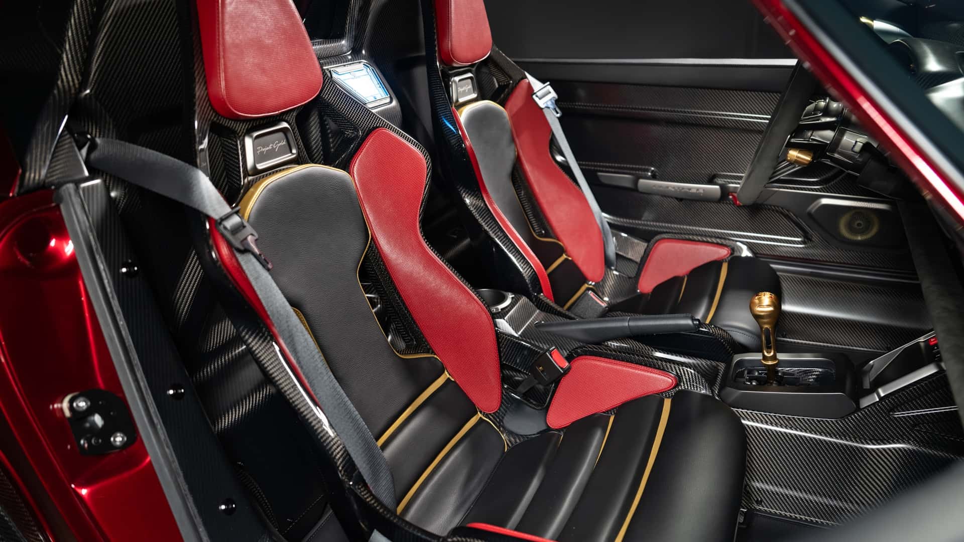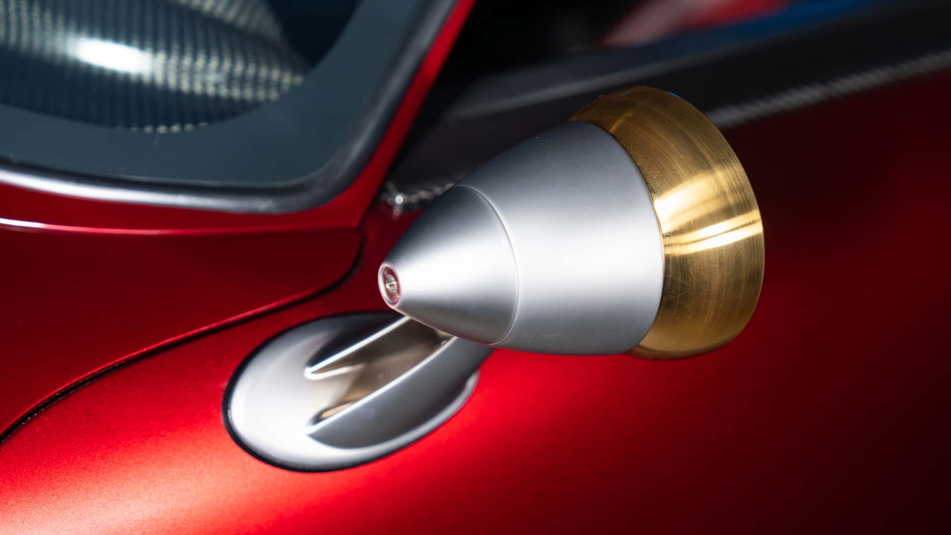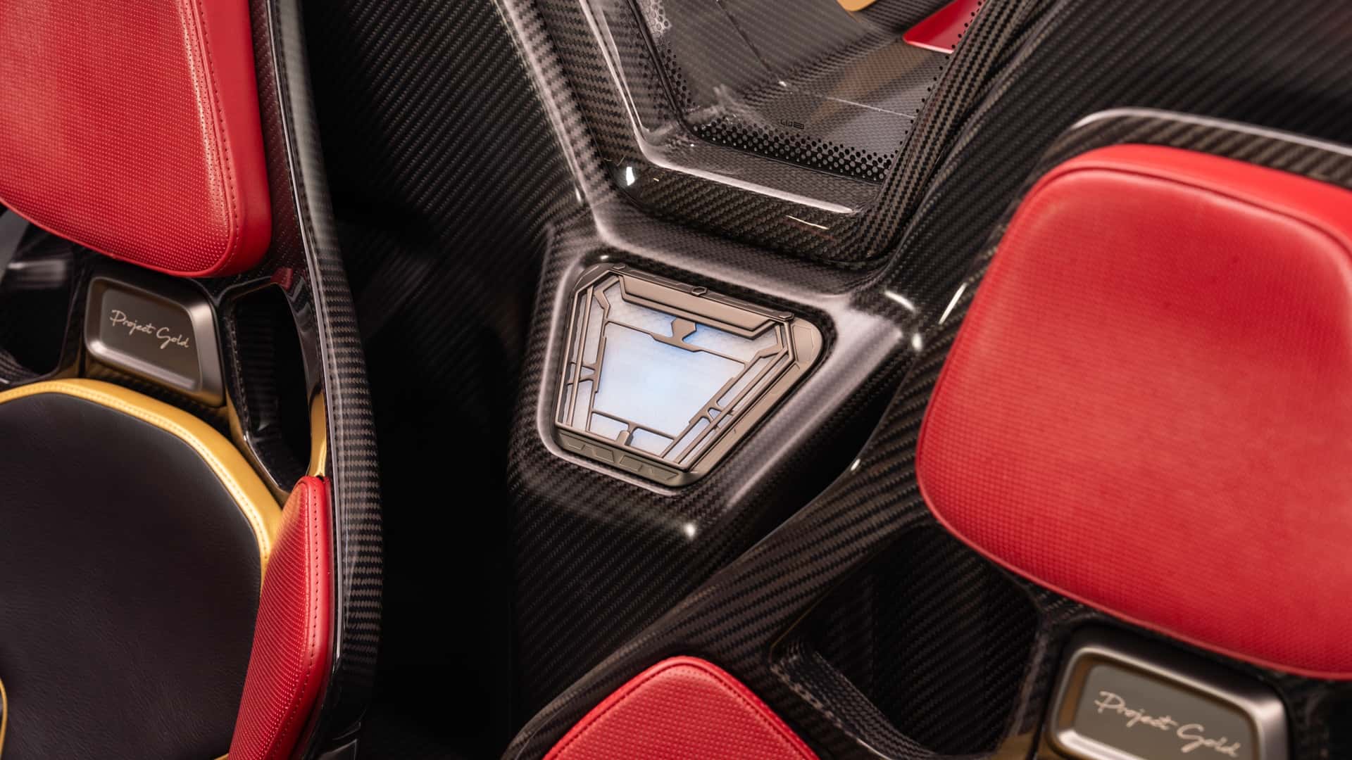 من النظرة الأولى، يفهم أي عشاق للأفلام المرجعية فورًا: هذا التصميم مستلهم من شخصية آيرون مان . الهيكل المصنوع كليًا من ألياف الكربون المطلية بلون أحمر عميق أُطلق عليه اسم True Candy Red، و يبدو كما لو كان درعًا أكثر منه طلاءً للسيارة. أما اللمسات الذهبية المنتشرة على الأجزاء الخارجية و الداخلية، فهي تذكير مباشر بالبدلة الآلية التي يرتديها توني ستارك .