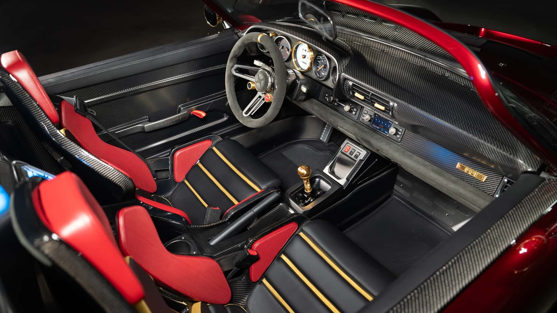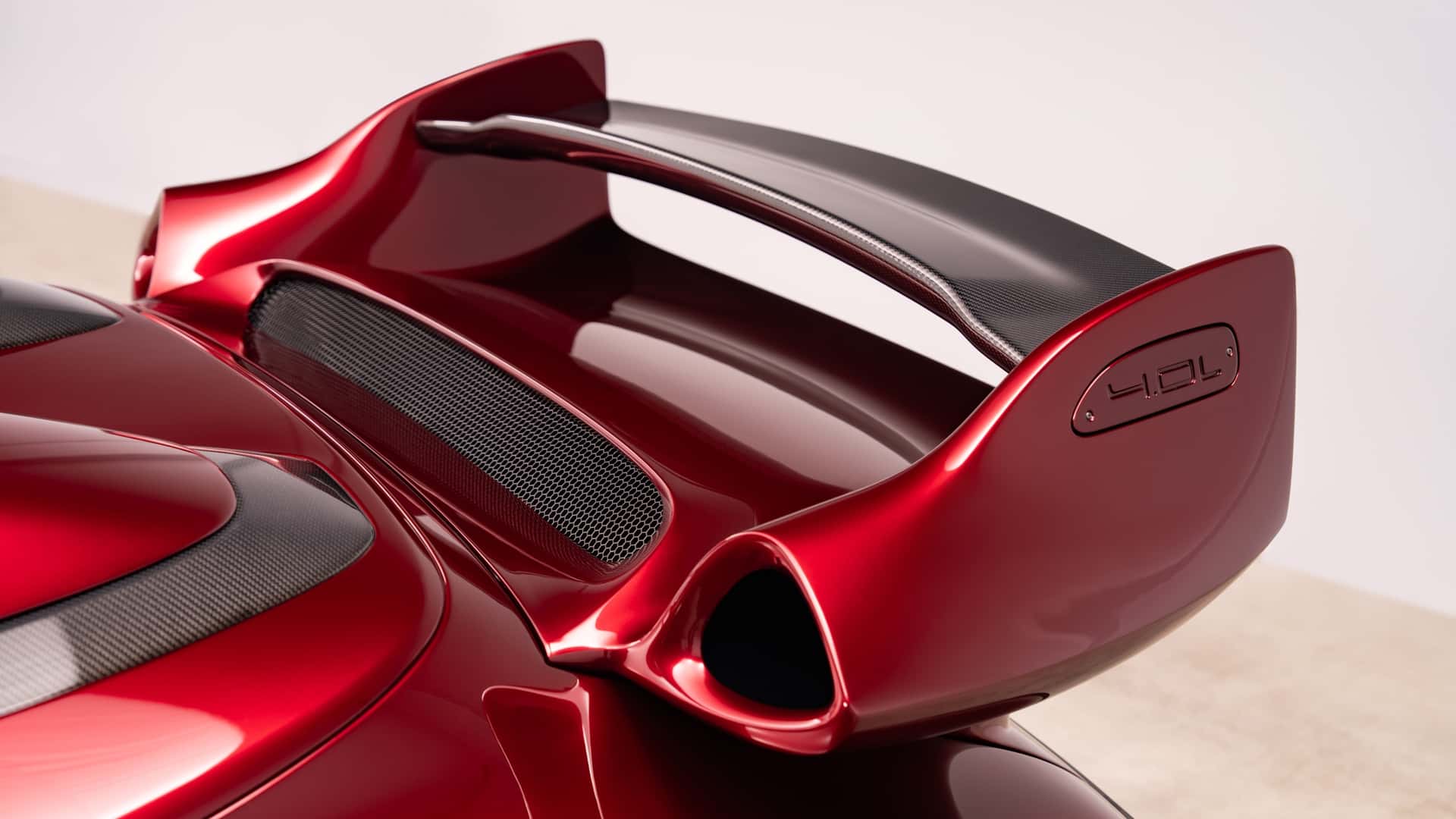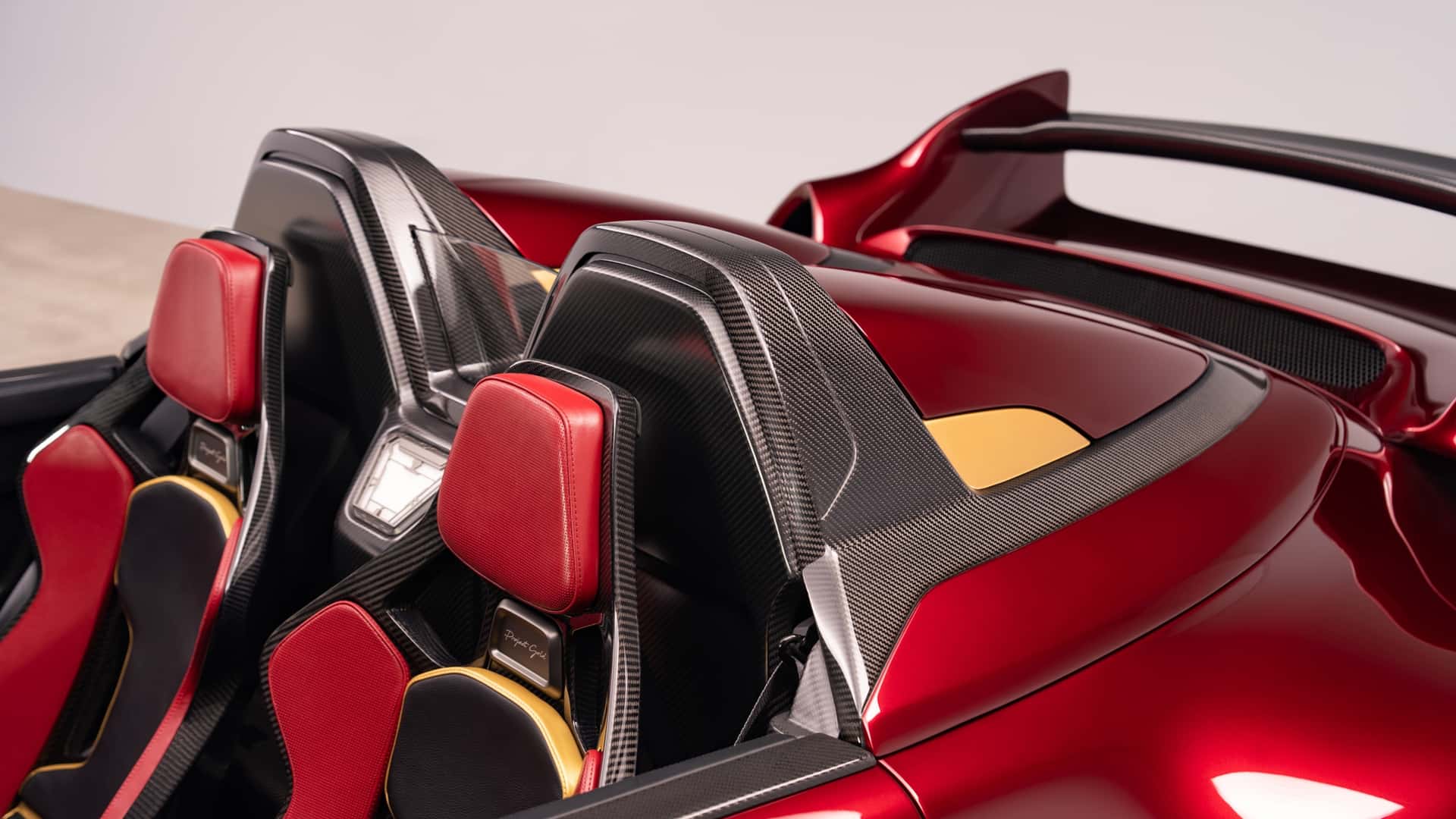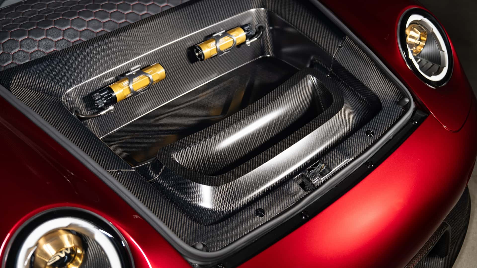 من النظرة الأولى، يفهم أي عشاق للأفلام المرجعية فورًا: هذا التصميم مستلهم من شخصية آيرون مان . الهيكل المصنوع كليًا من ألياف الكربون المطلية بلون أحمر عميق أُطلق عليه اسم True Candy Red، و يبدو كما لو كان درعًا أكثر منه طلاءً للسيارة. أما اللمسات الذهبية المنتشرة على الأجزاء الخارجية و الداخلية، فهي تذكير مباشر بالبدلة الآلية التي يرتديها توني ستارك .
