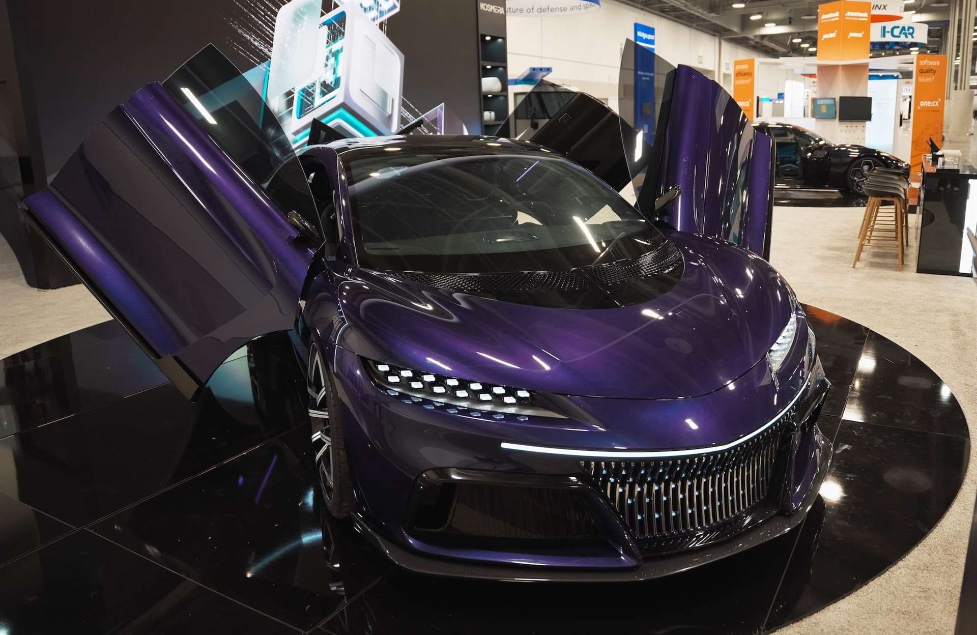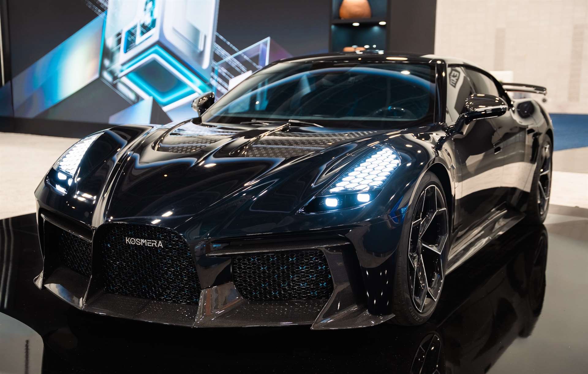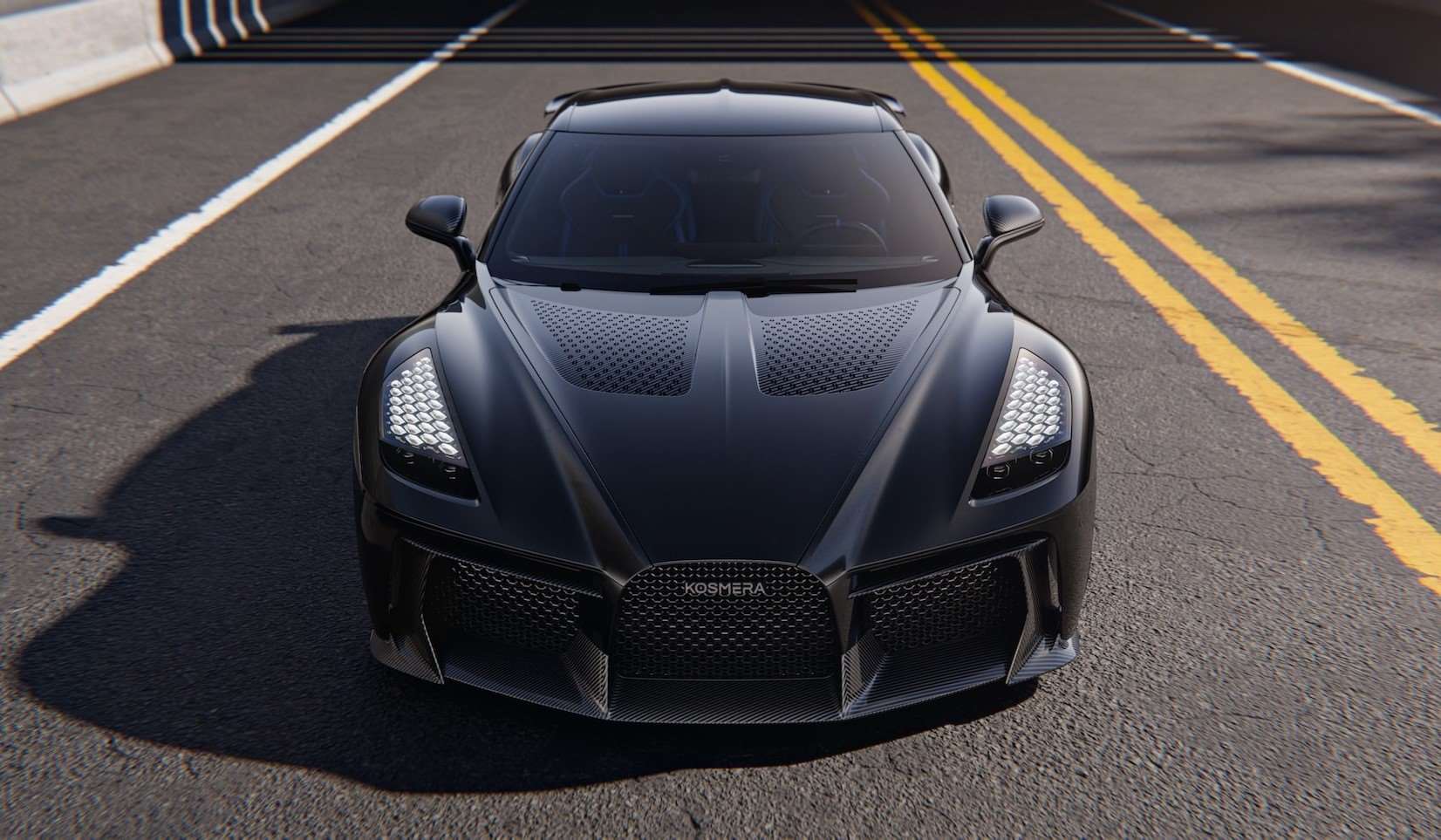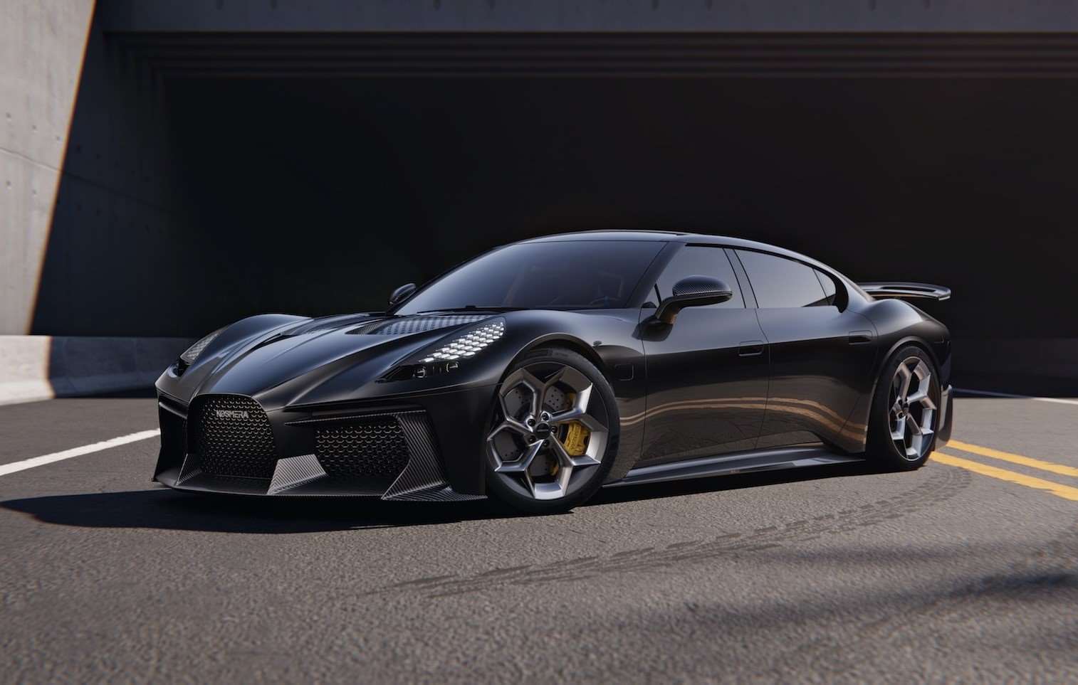 السيارة الخارقة الجديدة من كوسميرا تأتي بواجهة أمامية جريئة و شبك على شكل حدوة حصان يشبه الأنماط الأوروبية و لكنه يحمل توقيعاً خاصًا، مع فتحات تبريد مزدوجة الطبقات على الجانبين. كل شيء هنا يبدو وكأنه مُصمّم لتحسين الانسيابية و تبريد نظام الدفع الهائل.