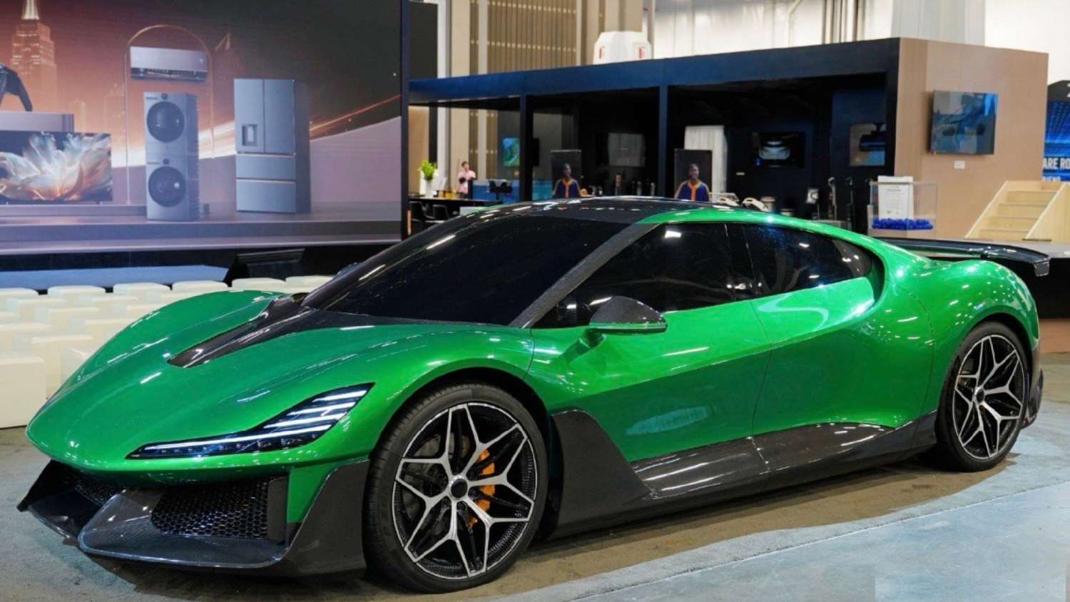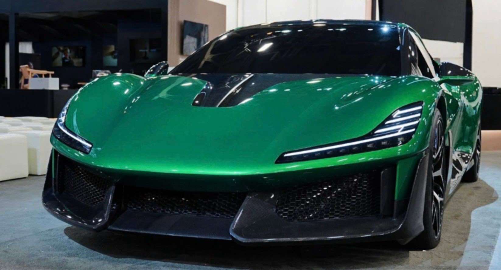 تميزت السيارة في العرض الخارجي بلون أخضر جذاب، مع تفاصيل دقيقة من ألياف الكربون على معظم أجزاء الهيكل، مثل المصابيح الأمامية بشكل حرف “L”، و عجلات ضخمة ذات ستة أضلع، و مكابح صفراء اللون تضيف لمسة رياضية جريئة.