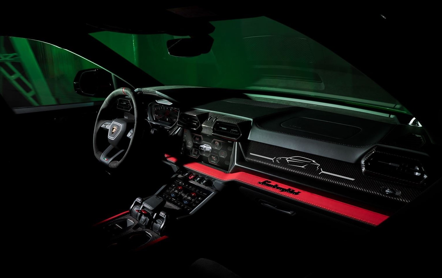 أما الألياف الكربونية، فهي كما اعتدنا مع لامبورجيني، تلعب دور البطولة. فهي تغطي أجزاء مثل الموزع الخلفي، أغطية المرايا، الحافة الأمامية، و ايضا بعض تفاصيل داخل المقصورة.