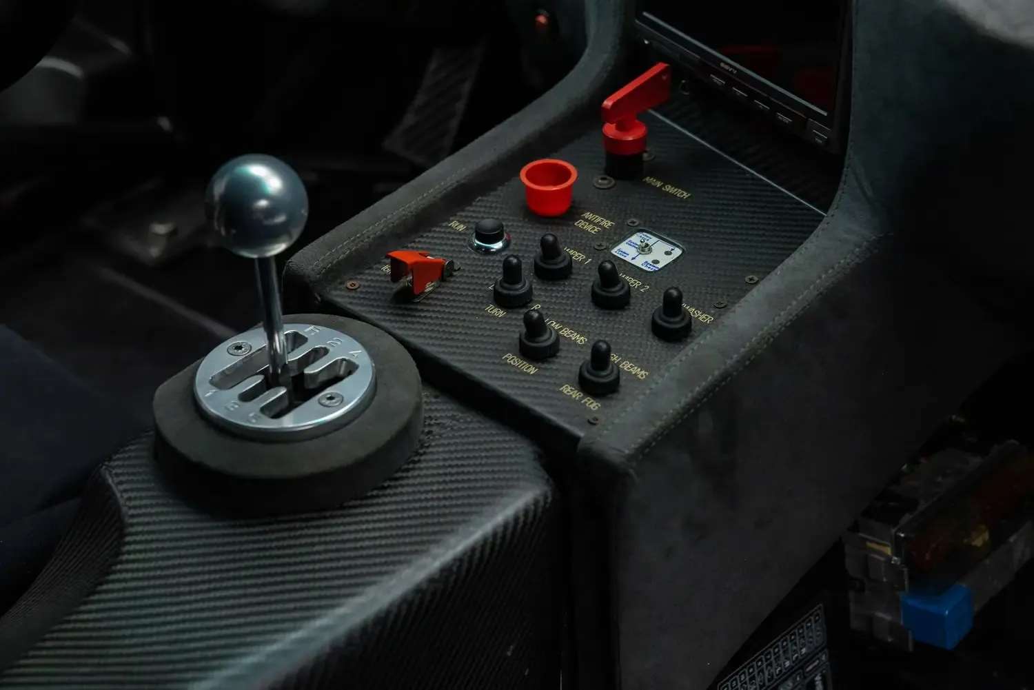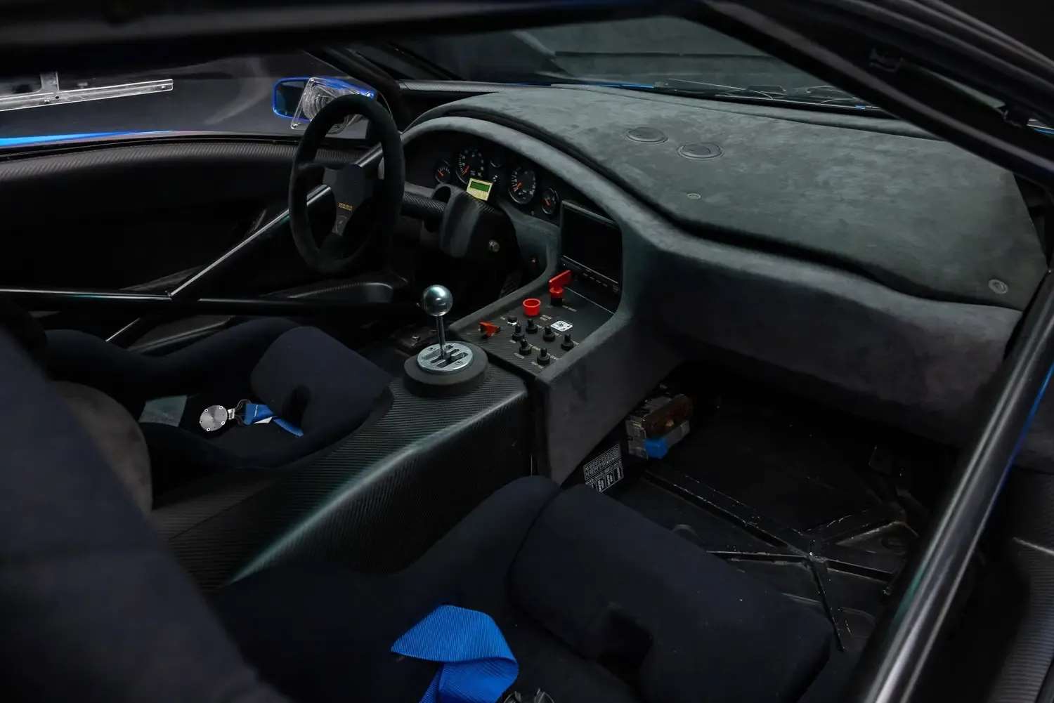 بدلاً من ذلك، ستجد قفص حماية كاملاً (Roll Cage) مطلياً باللون الأسود لحماية السائق، و مقعد سباق واحد من ألياف الكربون مكسو بجلد الشامواه (Alcantara) مع أحزمة أمان سداسية النقاط. لوحة القيادة مبسطة للغاية، حيث تم استبدال العدادات التقليدية بشاشة رقمية للسباقات توفر بيانات حيوية مثل درجة حرارة الزيت، ضغط الوقود، و توقيت الدورات.