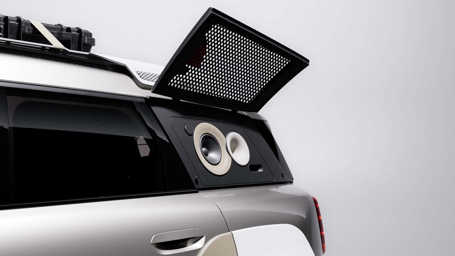 إذا فتحت أبواب هذه الكونتري مان، ستجد مكبرات التويتر و متوسطة التردد مدمجة في الهيكل نفسه، و كأن السيارة ولدت لتكون منصة DJ متنقلة. و عند فتح الباب الخلفي، تظهر السماعات الفرعية (Subwoofers) التي تضيف العمق و الإيقاع للصوت.