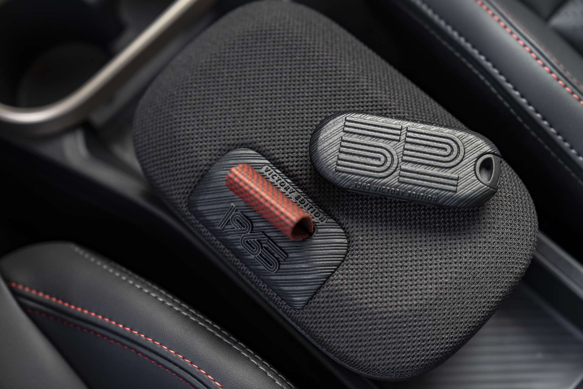 عند الدخول إلى المقصورة، يلاحظ السائق فورًا كتابة “1965” باللون الأبيض على عتبات الأبواب، فوق خلفية حمراء و سوداء، ما يمنح السيارة طابعًا حصريًا. كما تحتوي كل نسخة من هذا الإصدار على لوحة داخلية تذكارية تشير إلى تفاصيل الفوز التاريخي في الرالي.
