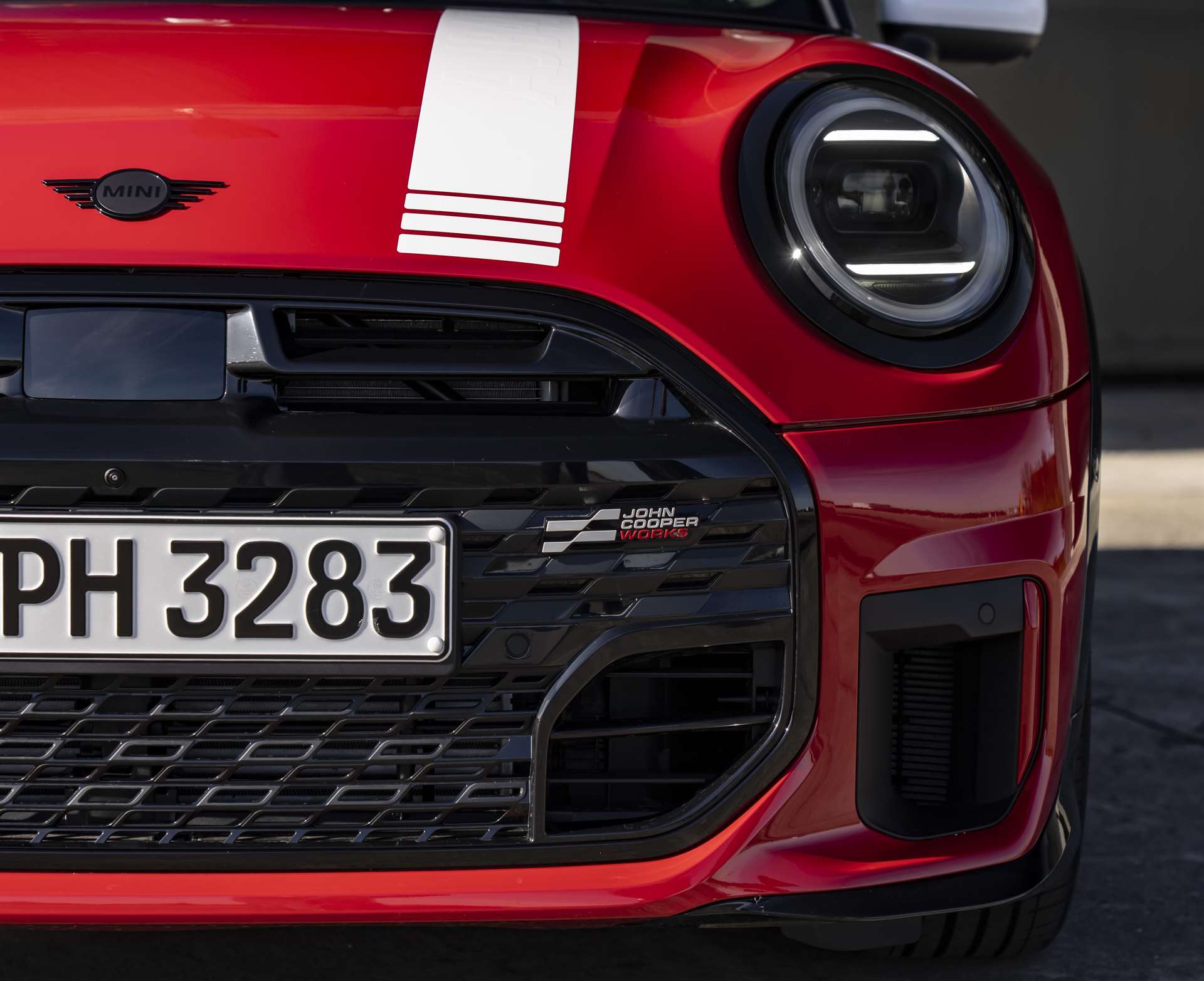 تعتمد المقصورة على ألوان JCW التقليدية، مع مزيج من الأسود الأنثراسيت و الأحمر، لتوفير أجواء رياضية أنيقة تتناغم مع الطلاء الخارجي. المقاعد و التشطيبات الداخلية تعكس حرفية MINI المعروفة، مع تركيز واضح على التفاصيل الدقيقة.