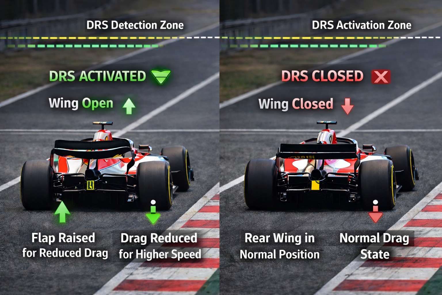 نظام DRS لم يكن مجرد تقنية هندسية، بل حل سريع لمشكلة أعقد: قلة التجاوزات المبهرة في السباقات. قدم لأول مرة في 2011 ليمنح السائق الذي يقل الفارق بينه و بين الذي أمامه عن ثانية واحدة فرصة لفتح الجناح الخلفي و تخفيف مقاومة الهواء و بالتالي الوصول لسرعة أعلى على الخط المستقيم.