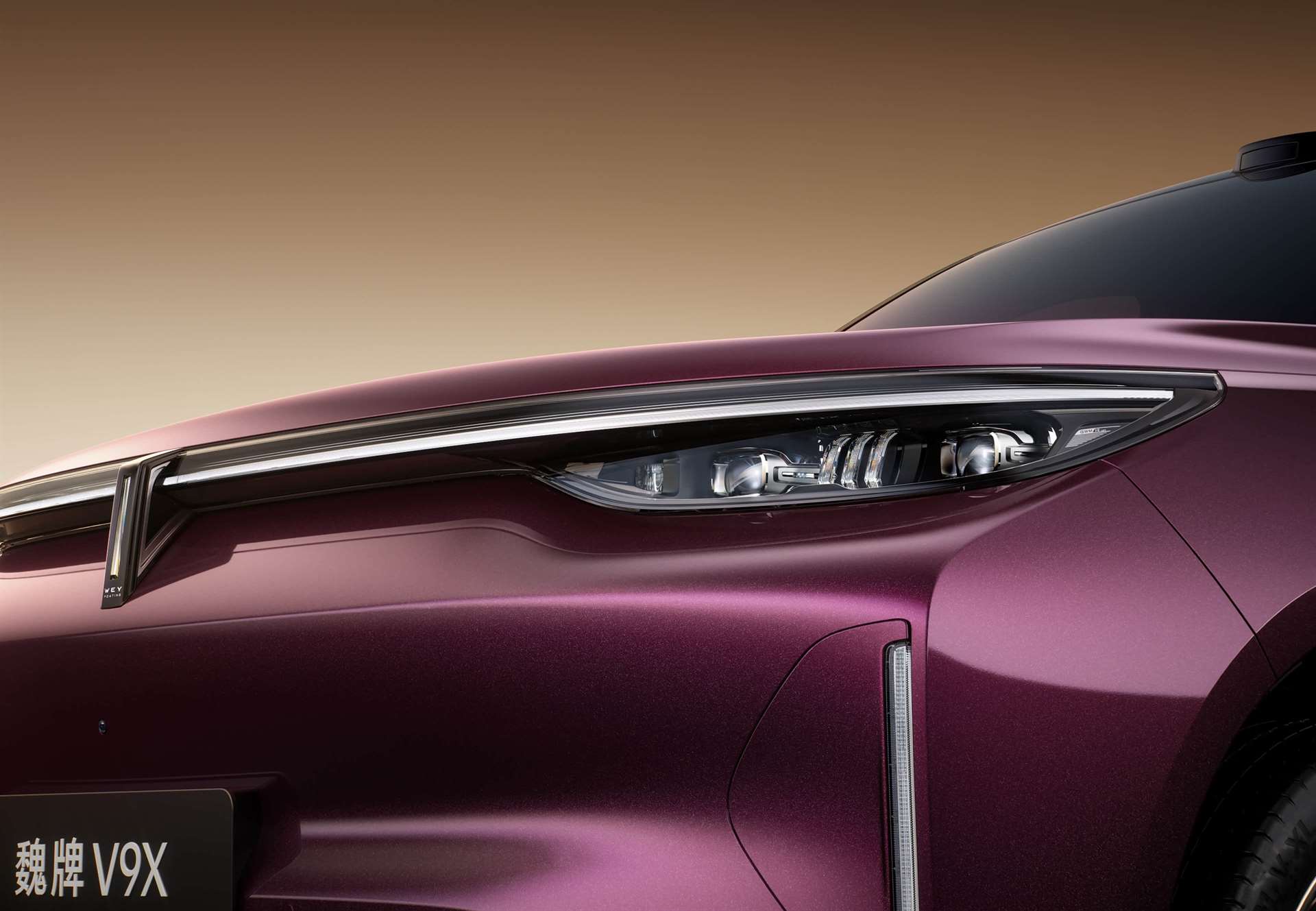 من النظرة الأولى، تبدو الـ Wey V9X و كأنها جاءت من المستقبل. الواجهة الأمامية مغلقة بالكامل لتعزيز الانسيابية، و تتوسطها شرائط إضاءة ممتدة بتأثير “حلقة النجوم”، تربط بين المصابيح الأمامية و تمنح السيارة حضورًا واسعًا و جريئًا.