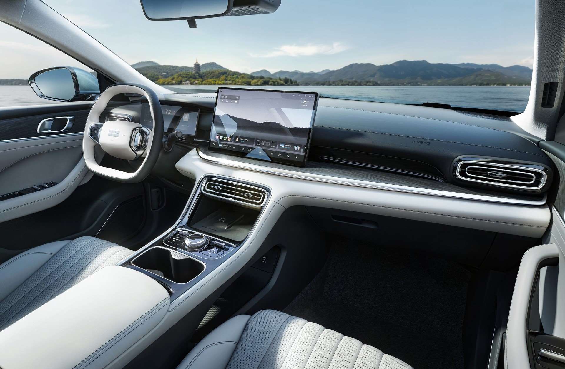 وفي قلب الكونسول الوسطي، شاشة لمس “عائمة” بقياس 14.6 إنش، تعمل بنظام Flyme Auto OS وتدعم تقنيتي HiCar وCarLink — لكنها لا تدعم Apple CarPlay أو Android Auto.