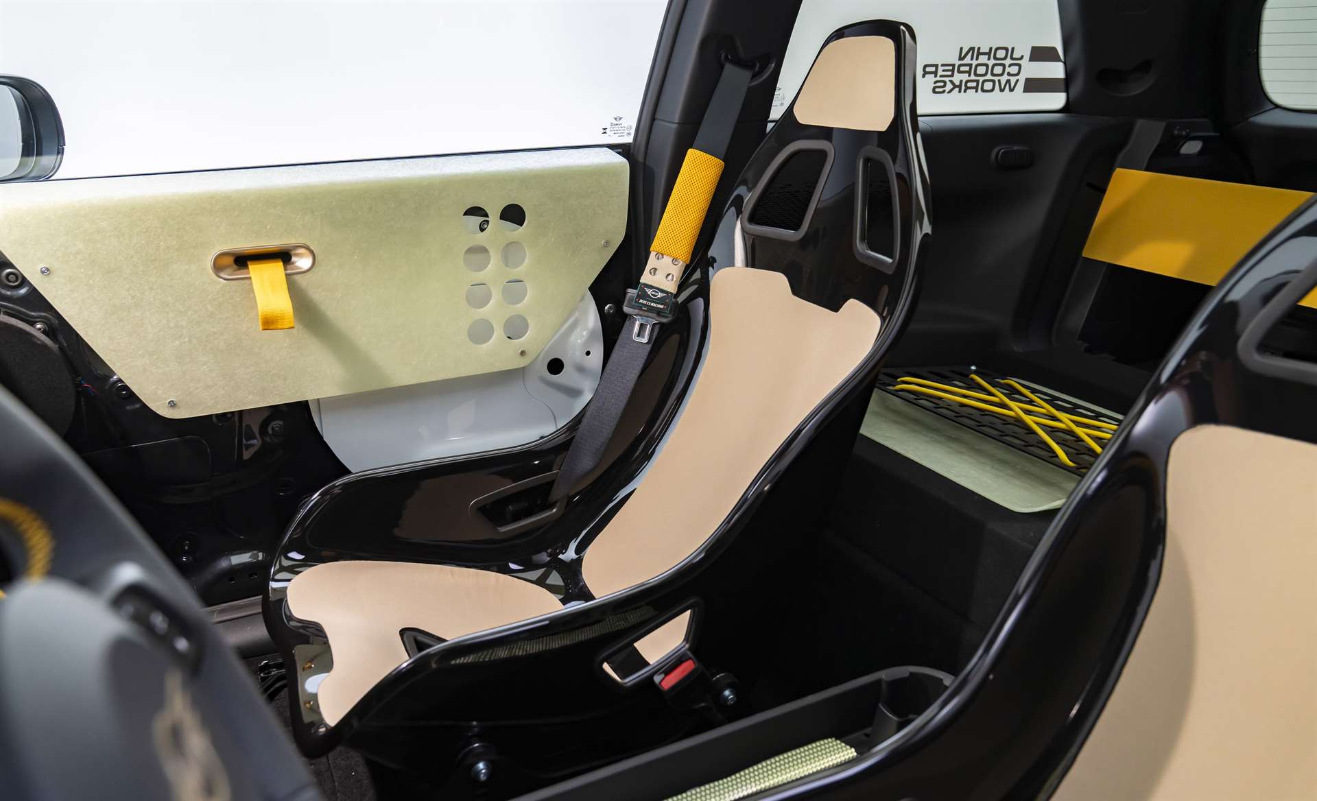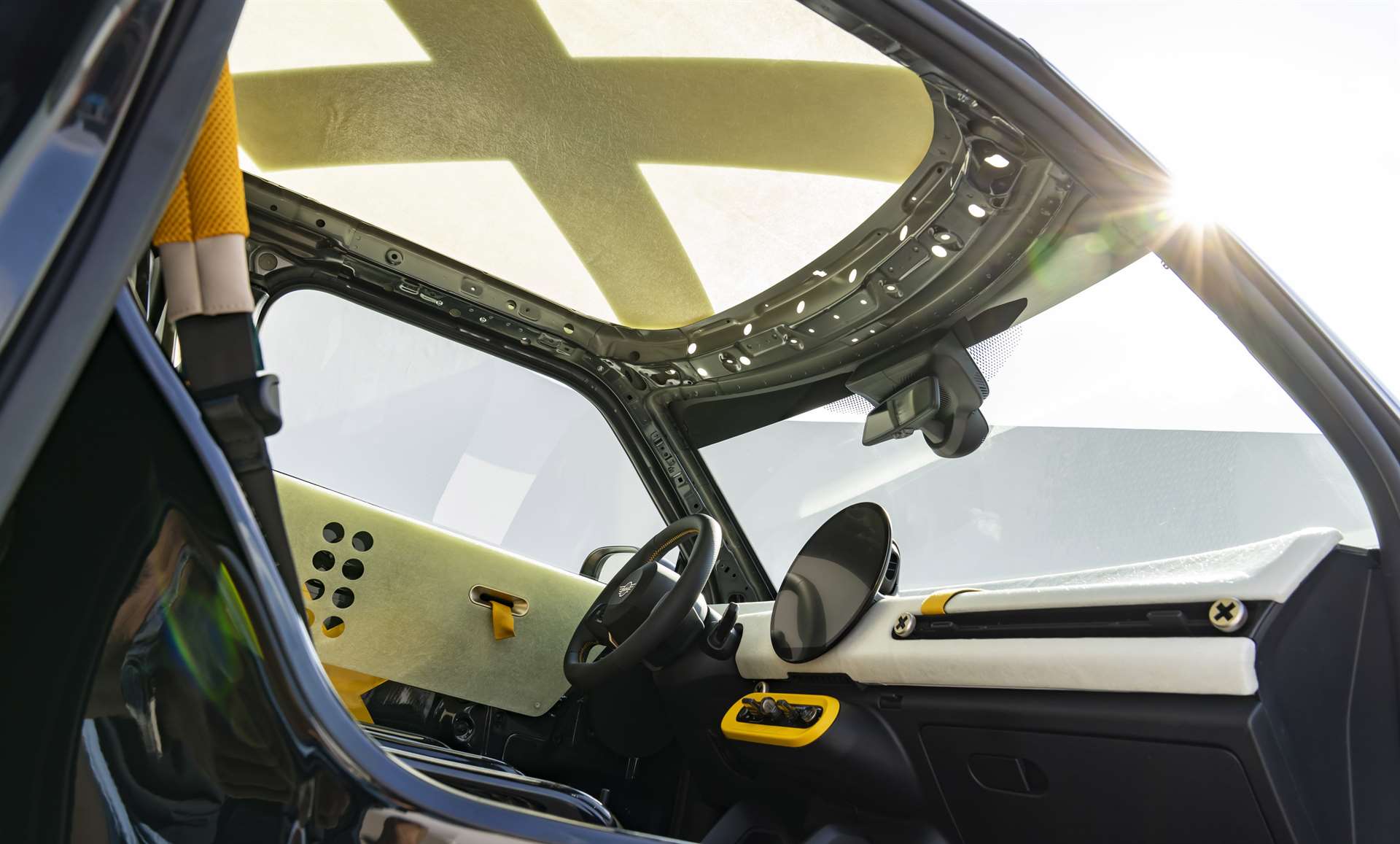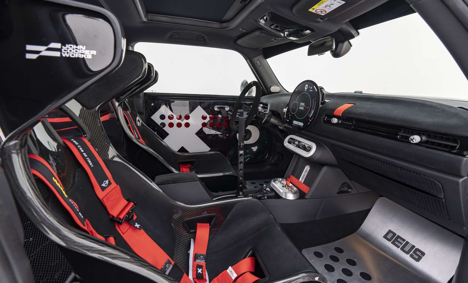 أما داخل المقصورة، فقد تم تخفيف كل شيء ليشبه سيارات السباق البسيطة، ويبرز فيه: