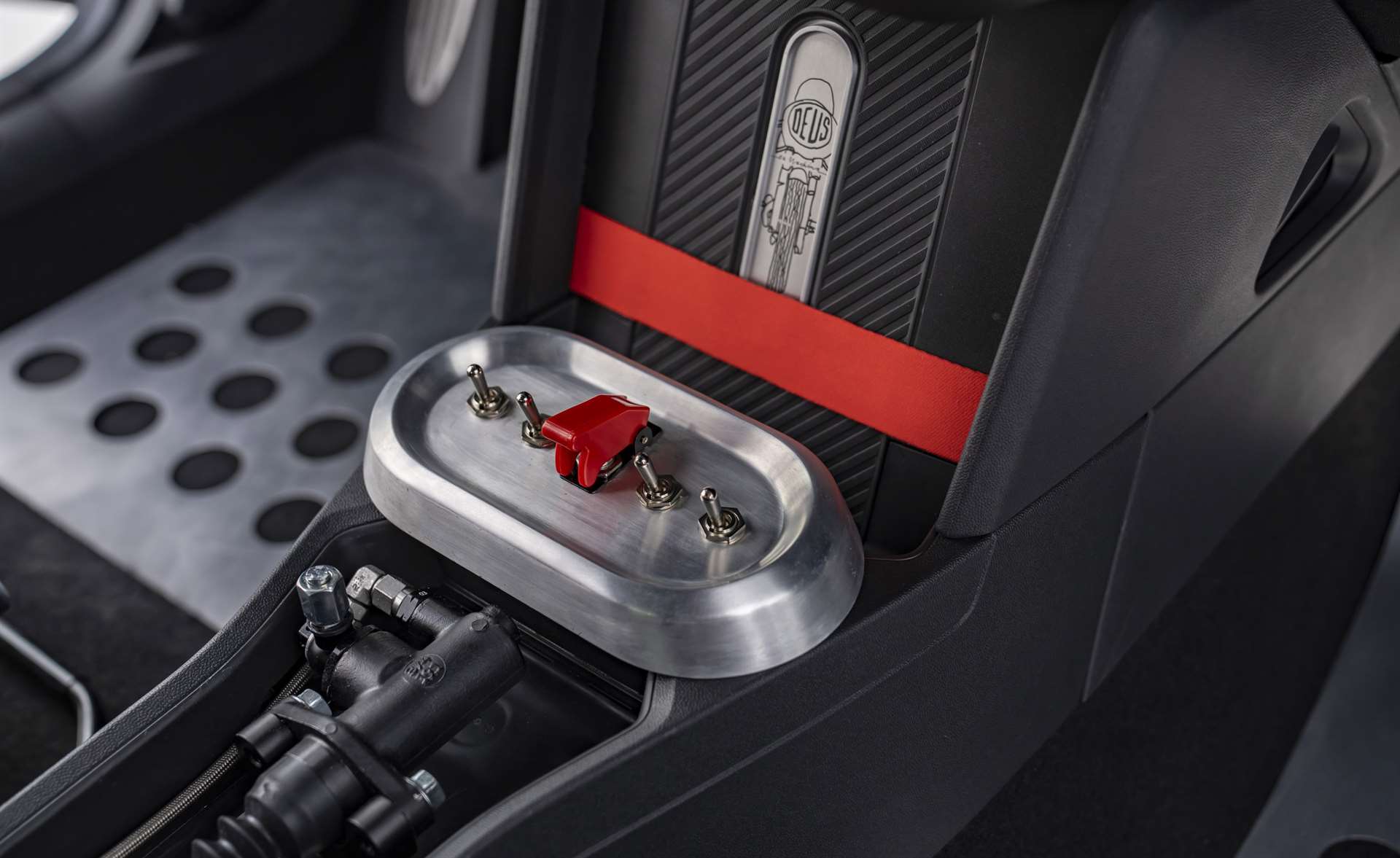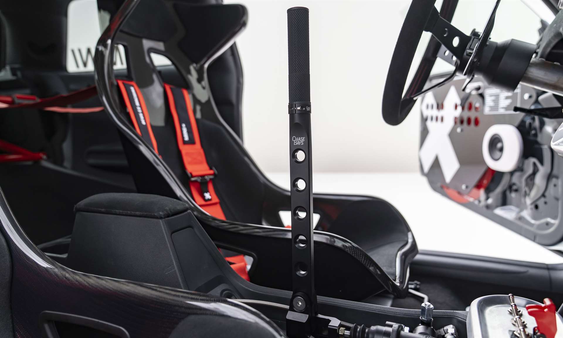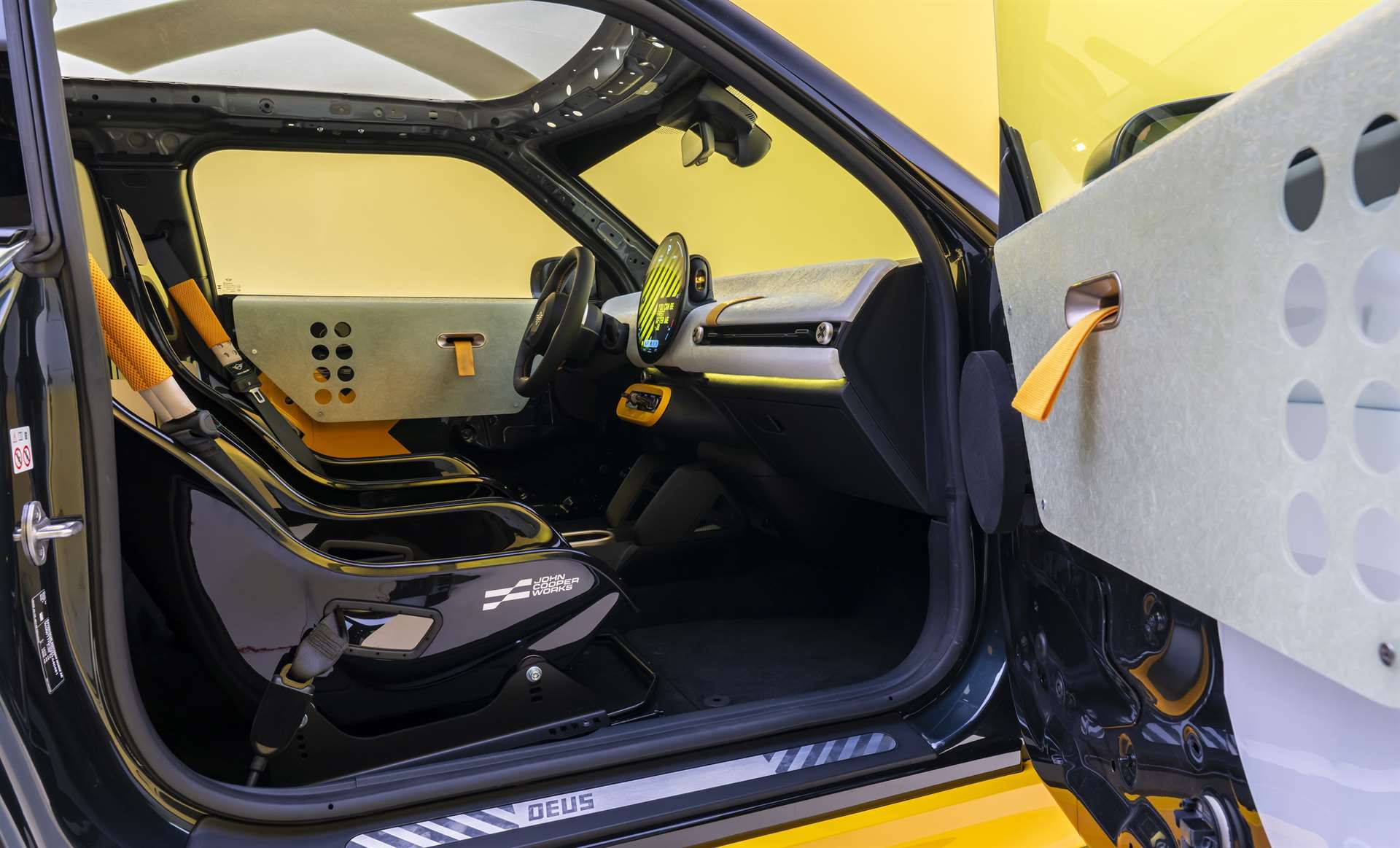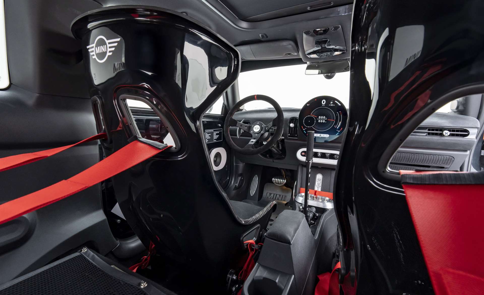 أما داخل المقصورة، فقد تم تخفيف كل شيء ليشبه سيارات السباق البسيطة، ويبرز فيه: