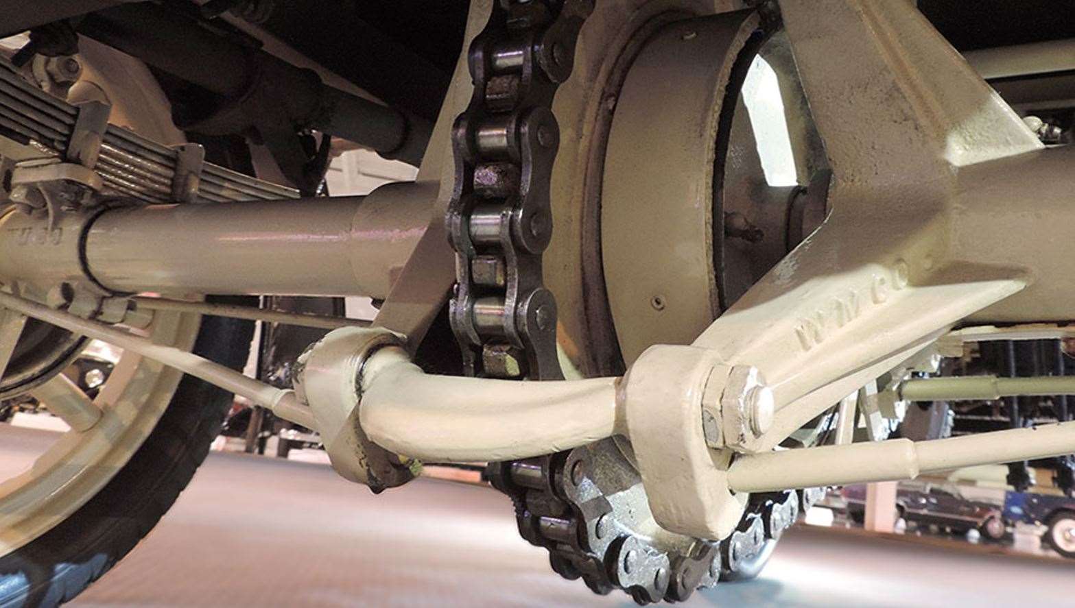 أما المكونات الميكانيكية، فاستُخدمت فيها نوابض ورقية (Leaf Springs) لتحمل الصدمات، والإطار الأمامي كان مكشوفًا بالكامل.