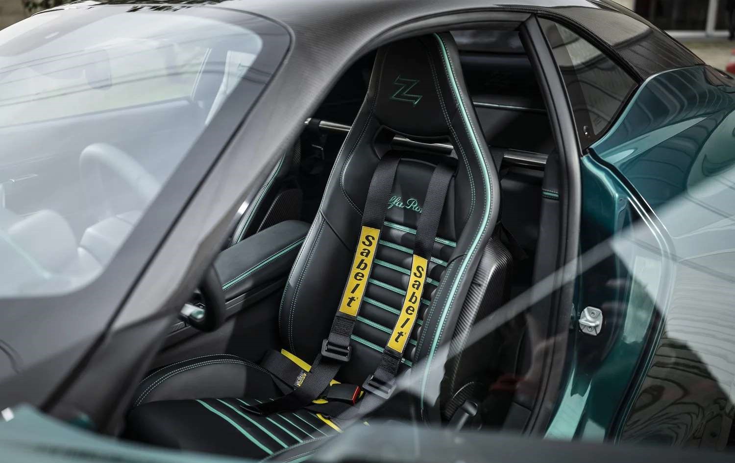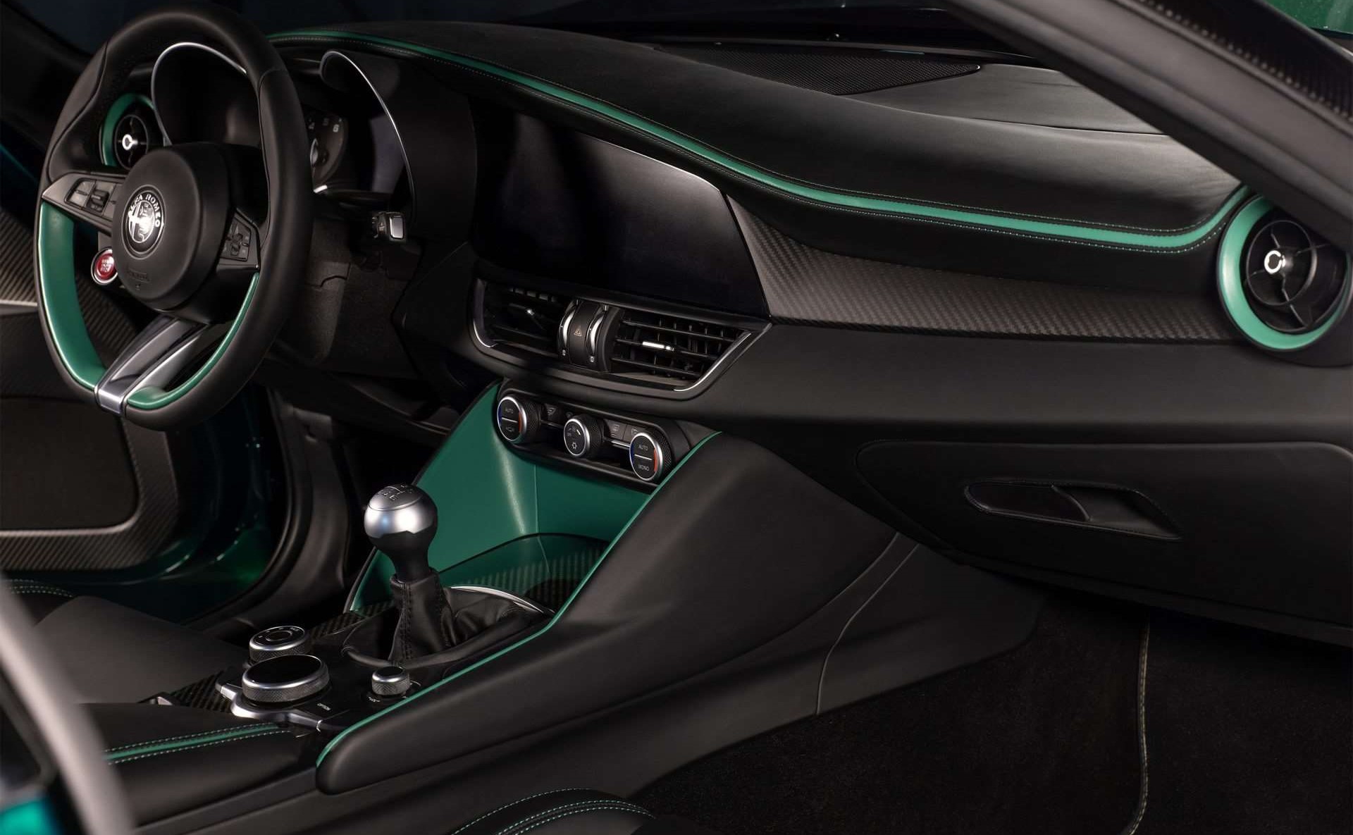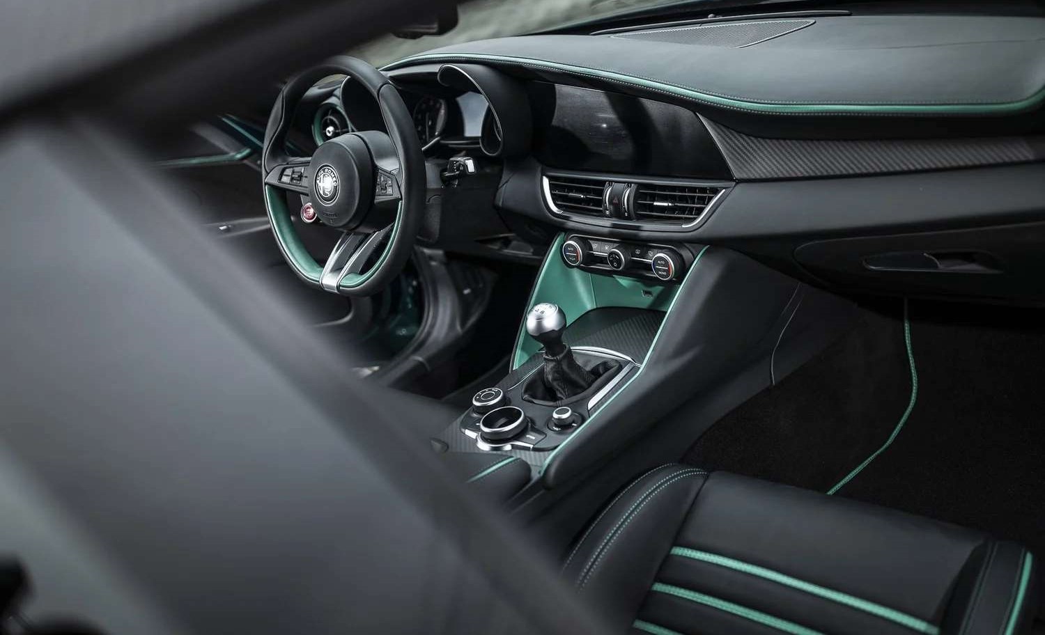 أما الأبواب، فهي بلا مقابض ظاهرة، وتفتح بضغطة زر، لتكشف عن مقصورة مألوفة من جوليا، لكن بمقاعد رياضية من الكربون، مغلفة بالجلد الأسود ولمسات خضراء تتماشى مع طلاء السيارة الخارجي.