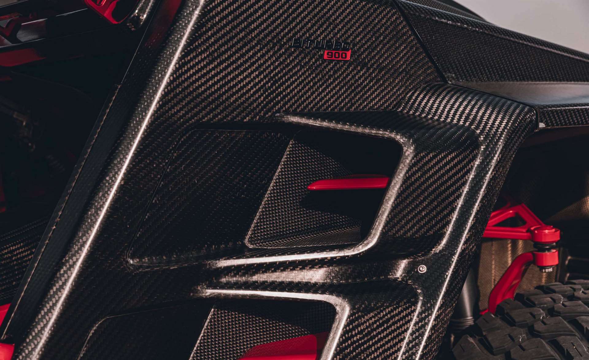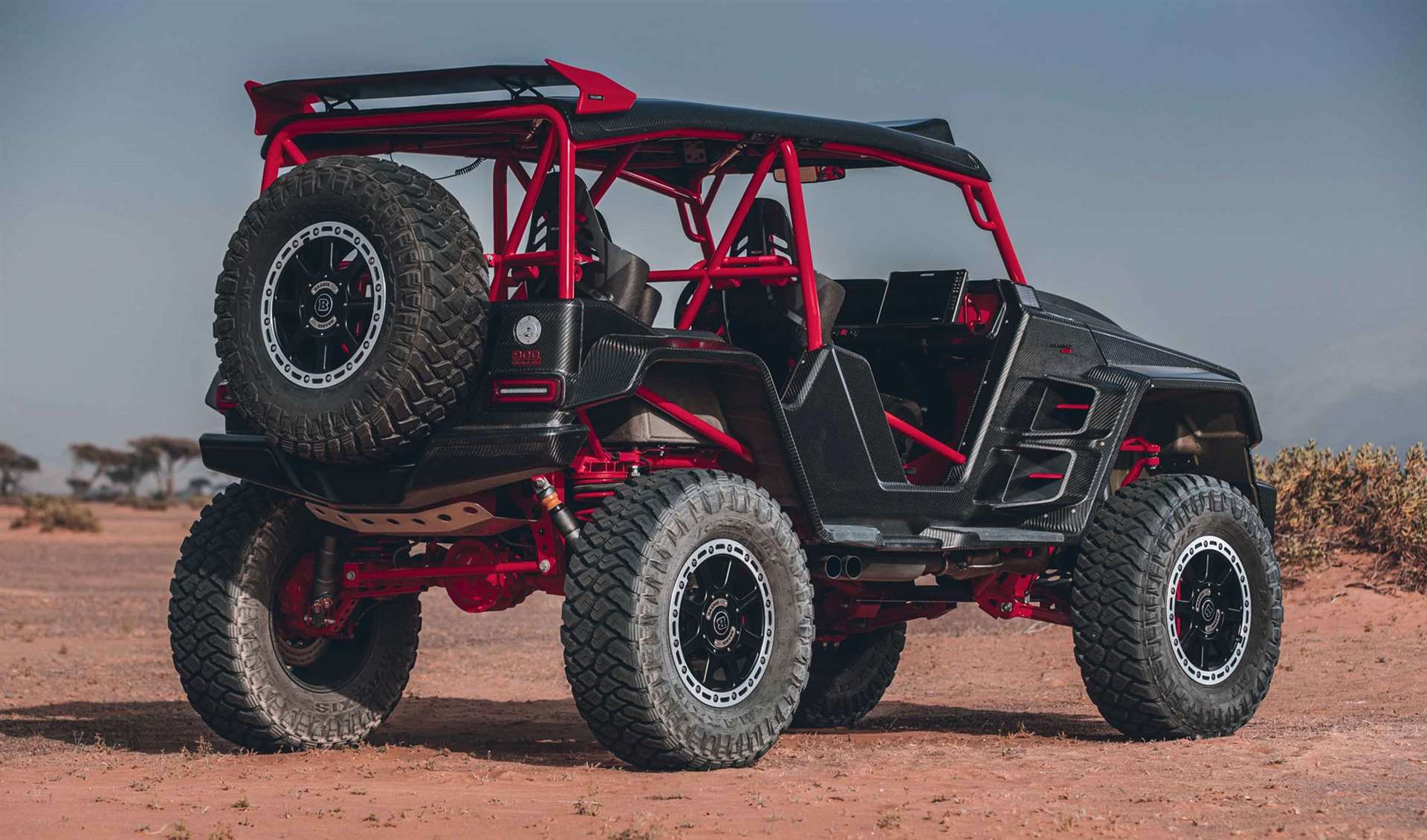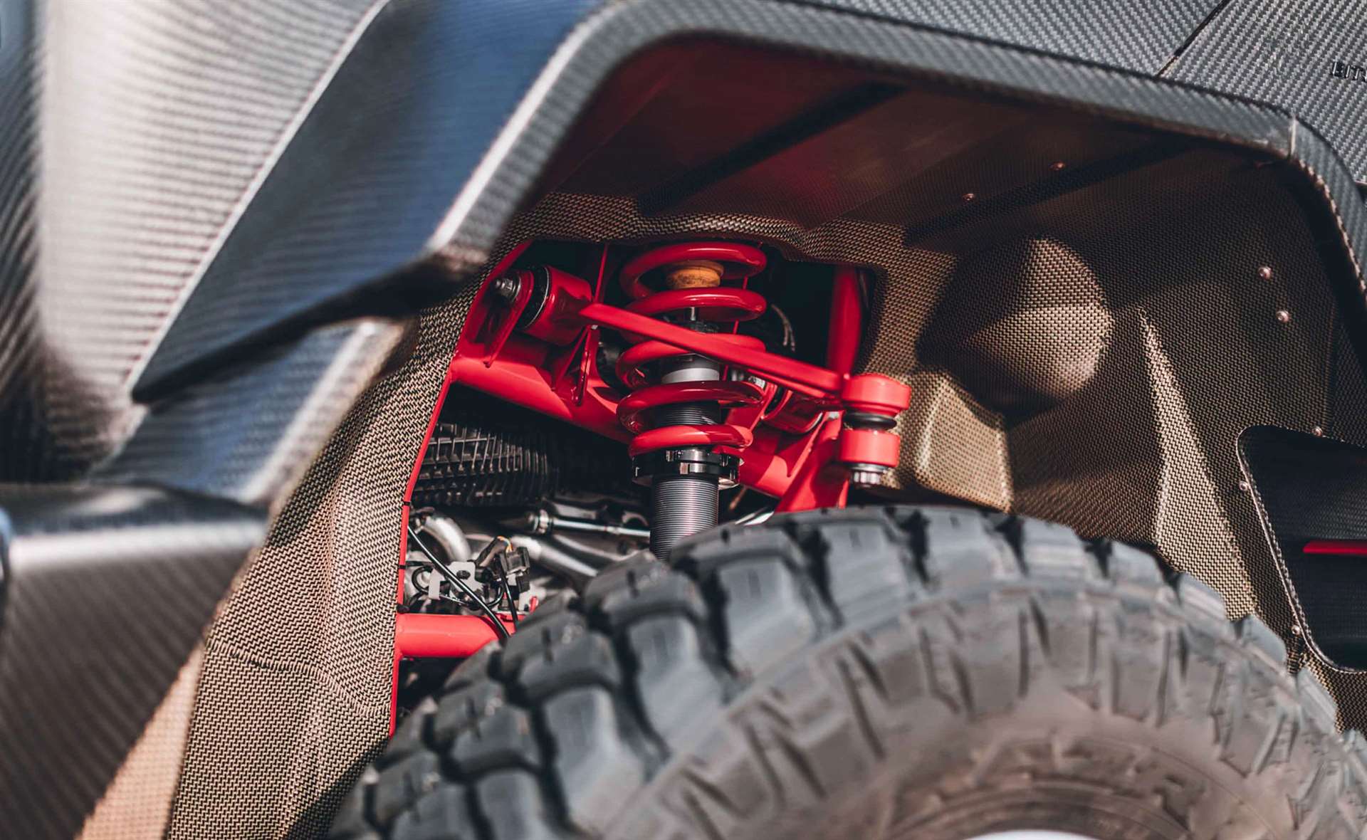 التصميم الخارجي خفيف ولاذع، بفضل هياكل من ألياف الكربون المكشوفة بالكامل، بدون أي أبواب أو نوافذ. نعم، لا أبواب ولا شبابيك! هيكل أنبوبي مفتوح كما في سيارات السباق على الطرق الوعرة، مجهز لحماية السائق والركّاب من أقسى الظروف وأخطر التضاريس.