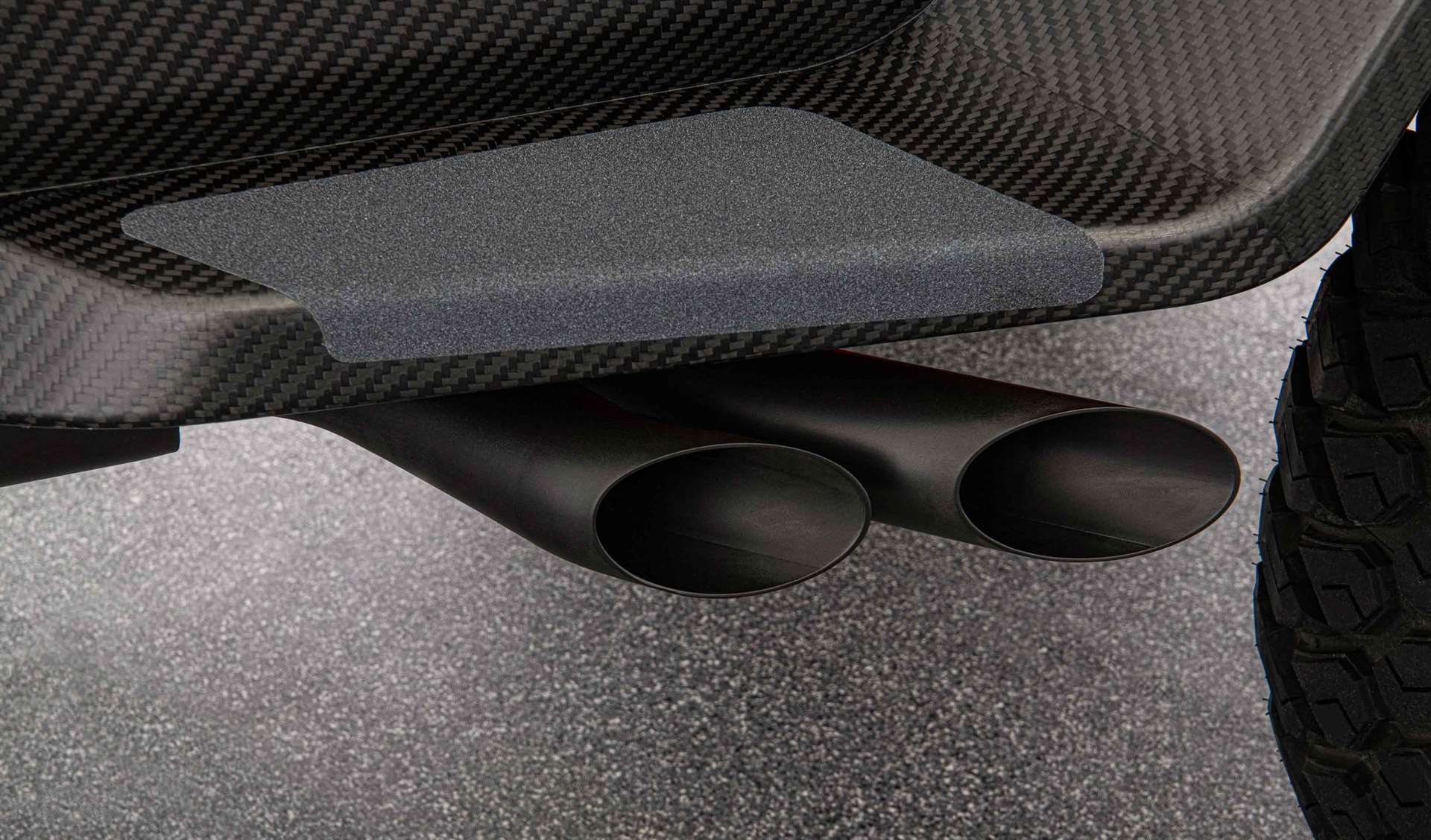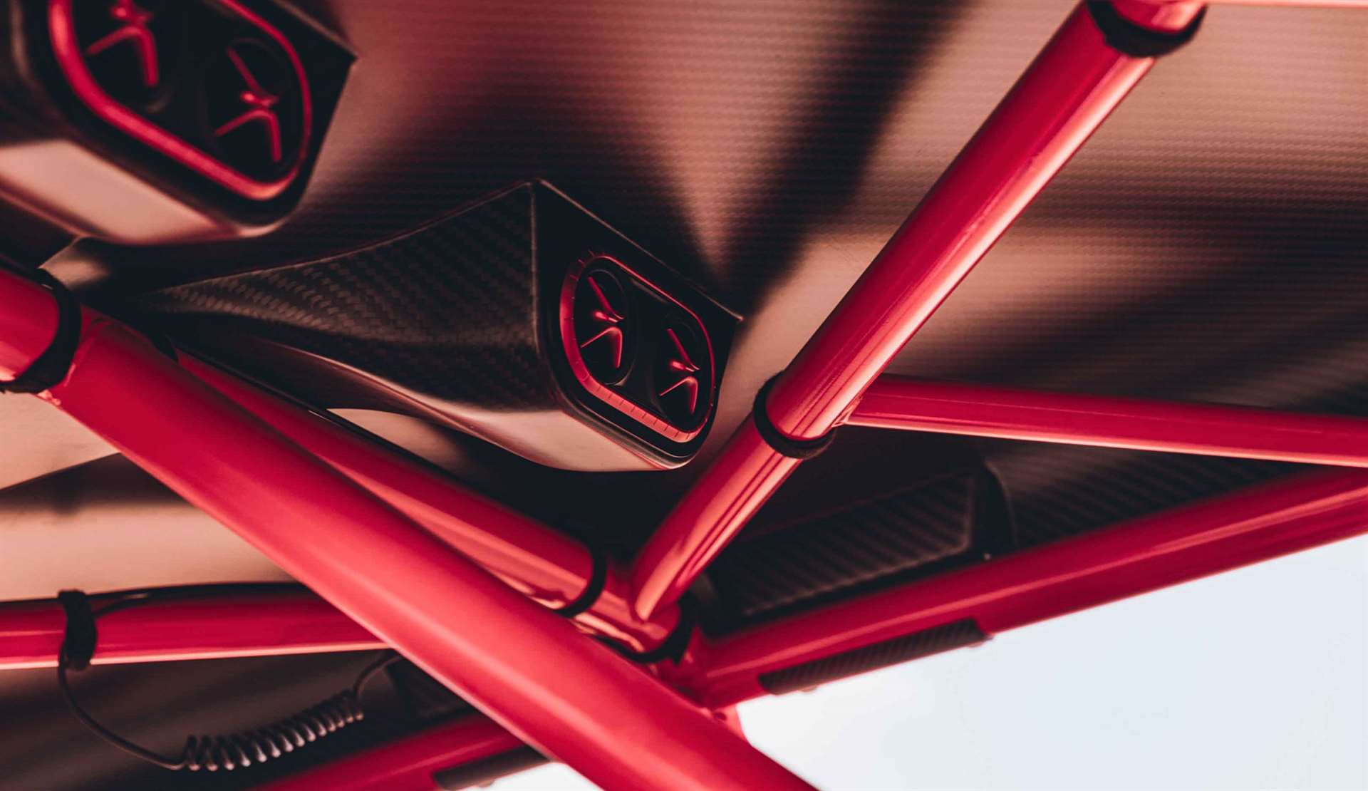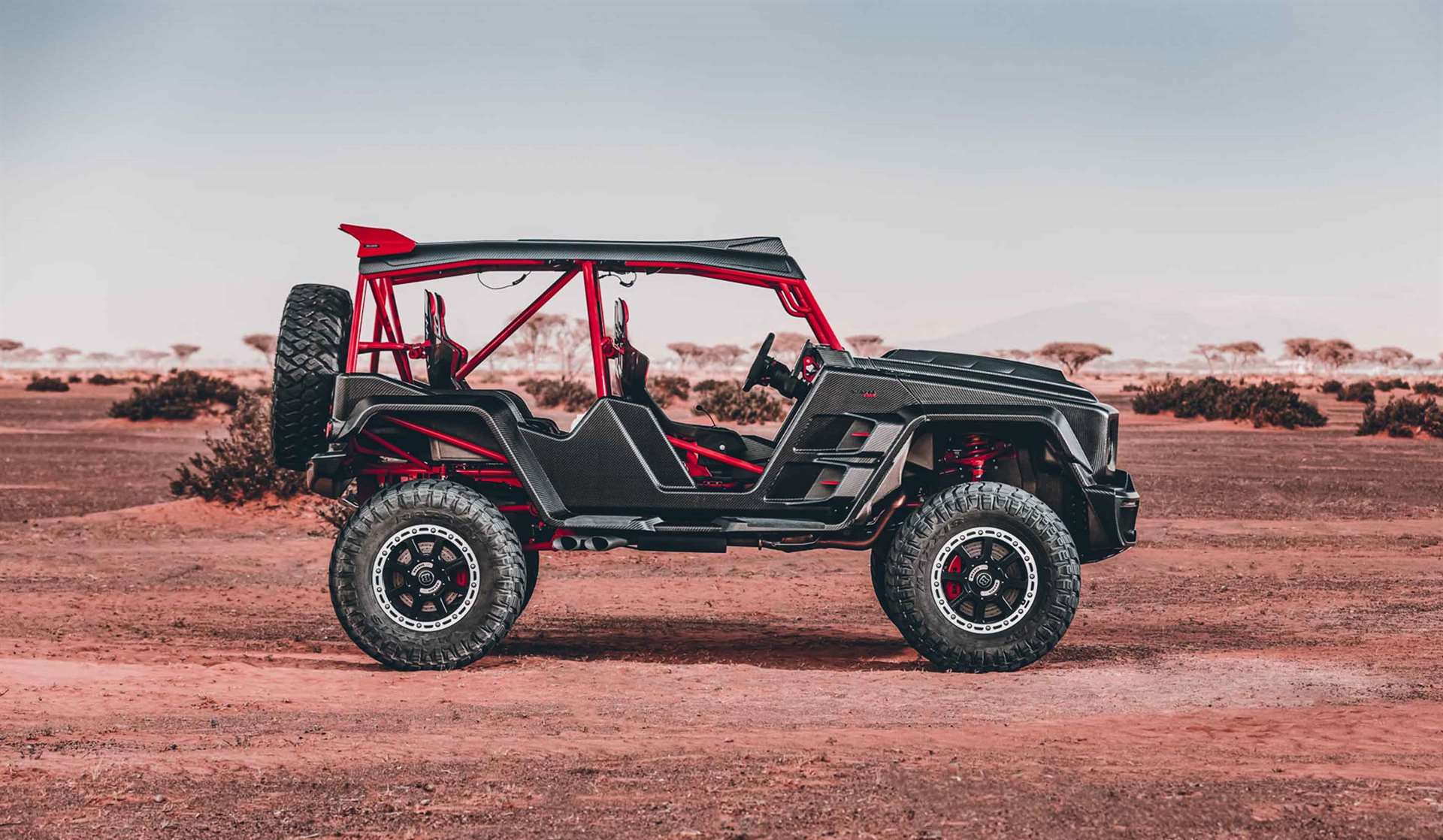 التصميم الخارجي خفيف ولاذع، بفضل هياكل من ألياف الكربون المكشوفة بالكامل، بدون أي أبواب أو نوافذ. نعم، لا أبواب ولا شبابيك! هيكل أنبوبي مفتوح كما في سيارات السباق على الطرق الوعرة، مجهز لحماية السائق والركّاب من أقسى الظروف وأخطر التضاريس.
