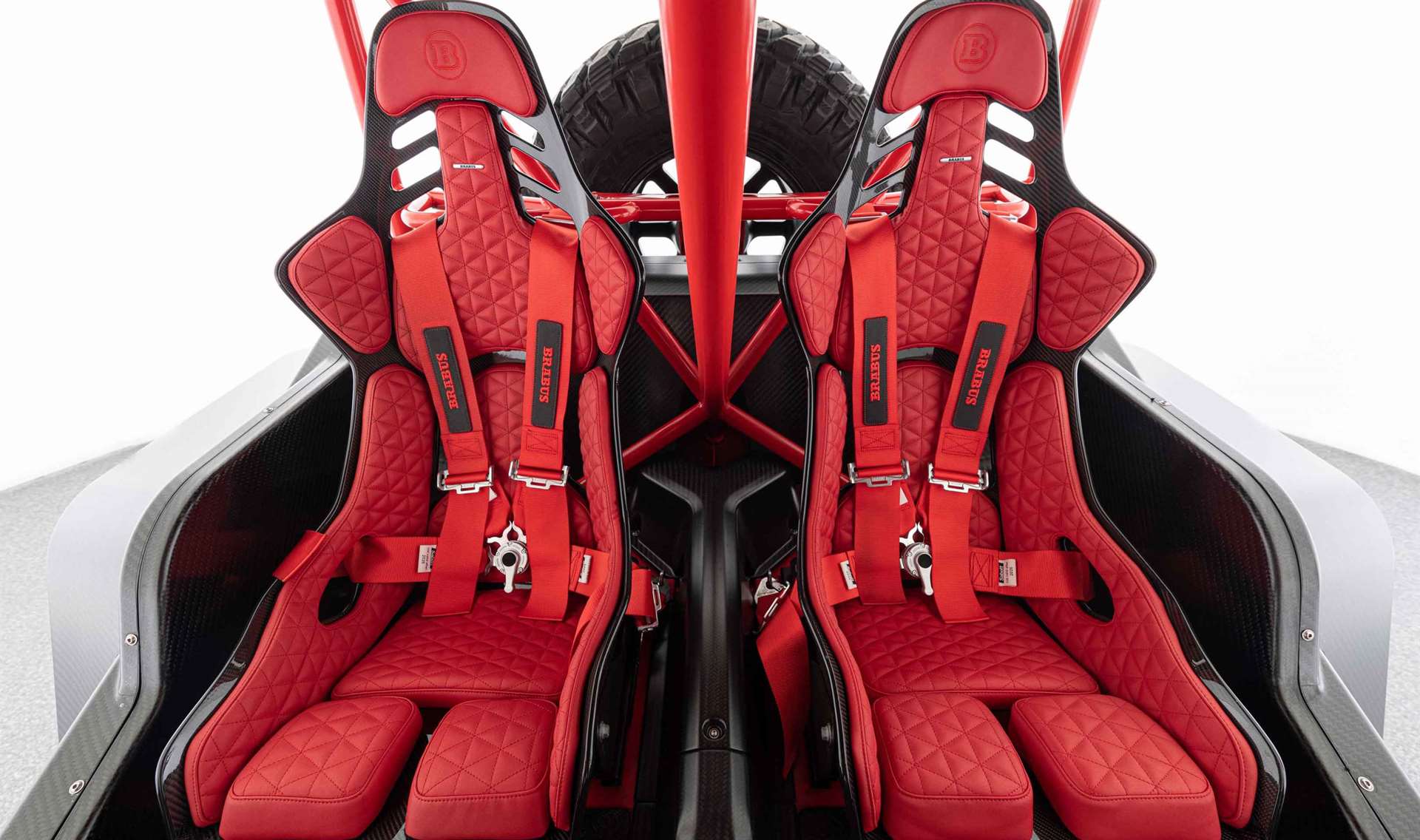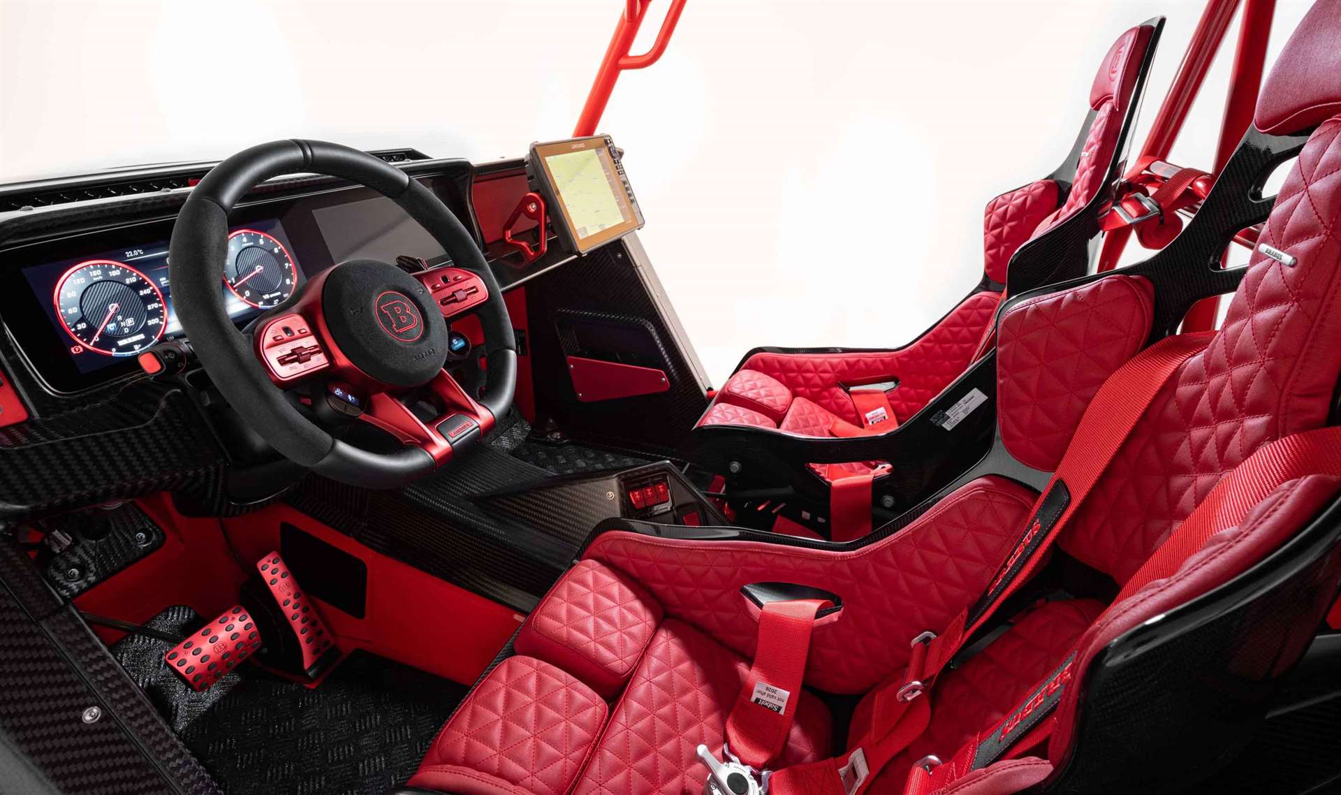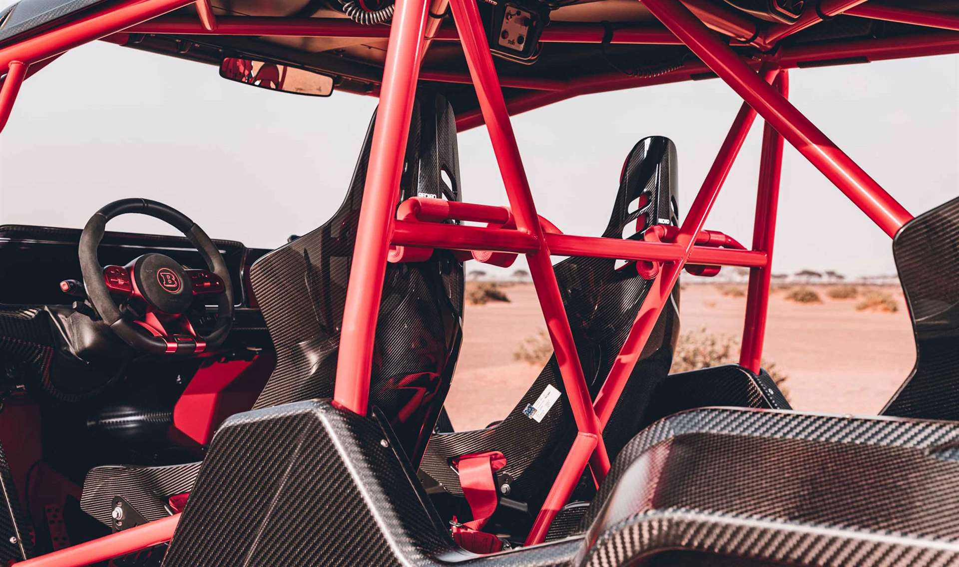 على الرغم من تصميمها المفتوح والجاهز للمعارك الرملية، لم تهمل برابوس اللمسات الفاخرة في الداخل. المقصورة تتسع لأربعة ركّاب على مقاعد سباق Carbon Recaro مع أحزمة أمان خماسية النقاط.