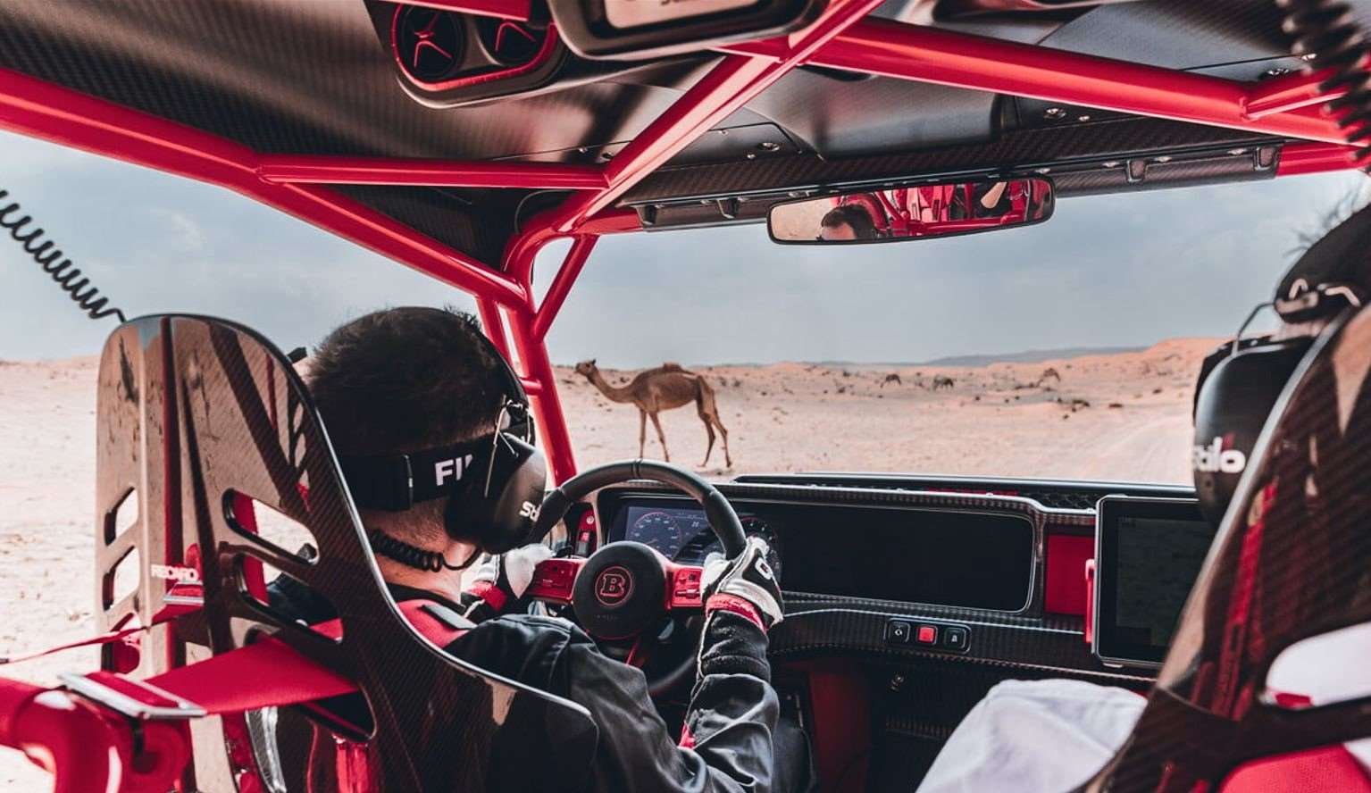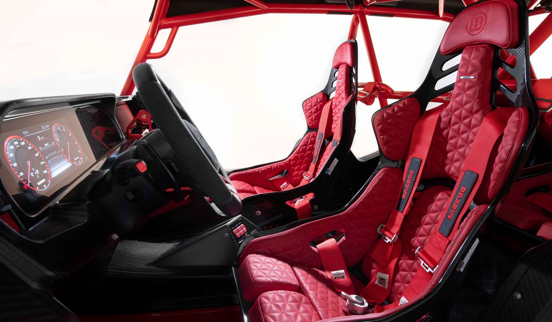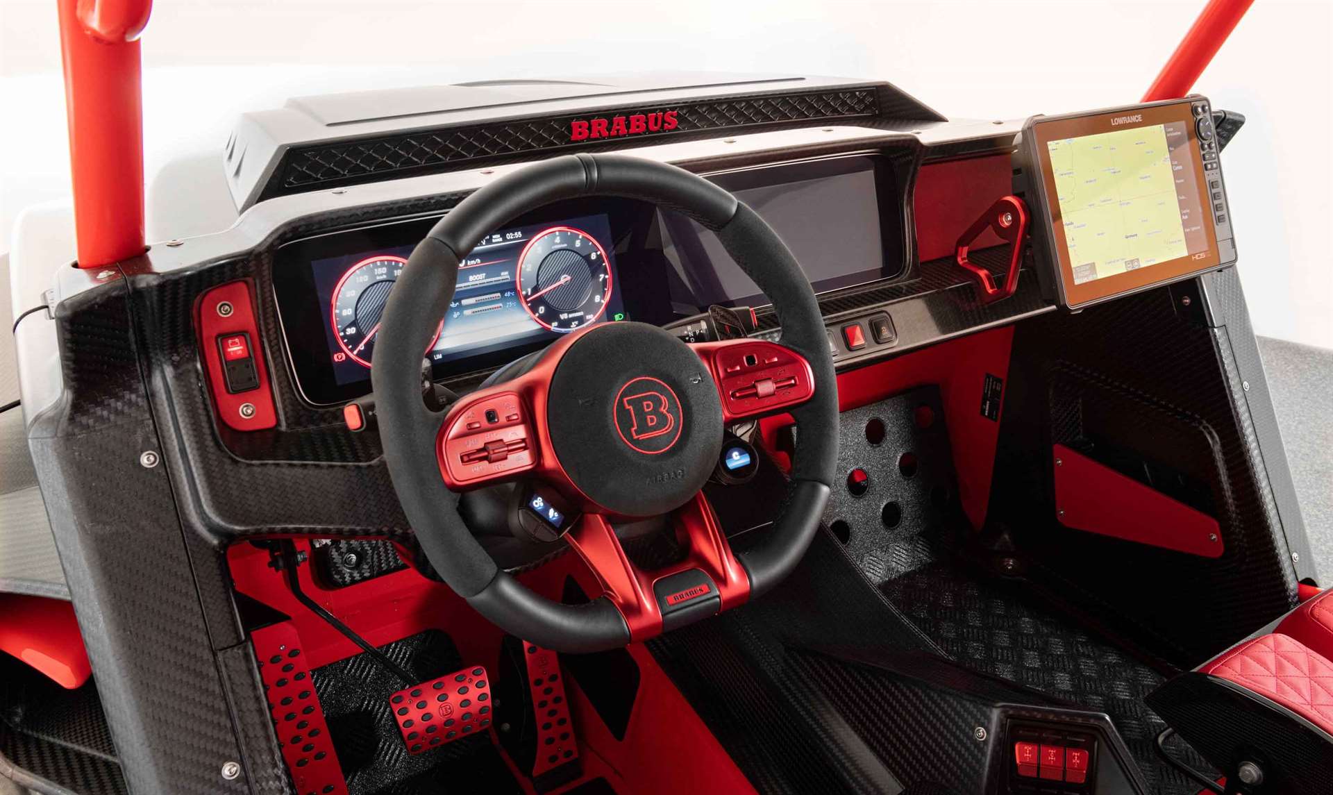 على الرغم من تصميمها المفتوح والجاهز للمعارك الرملية، لم تهمل برابوس اللمسات الفاخرة في الداخل. المقصورة تتسع لأربعة ركّاب على مقاعد سباق Carbon Recaro مع أحزمة أمان خماسية النقاط.