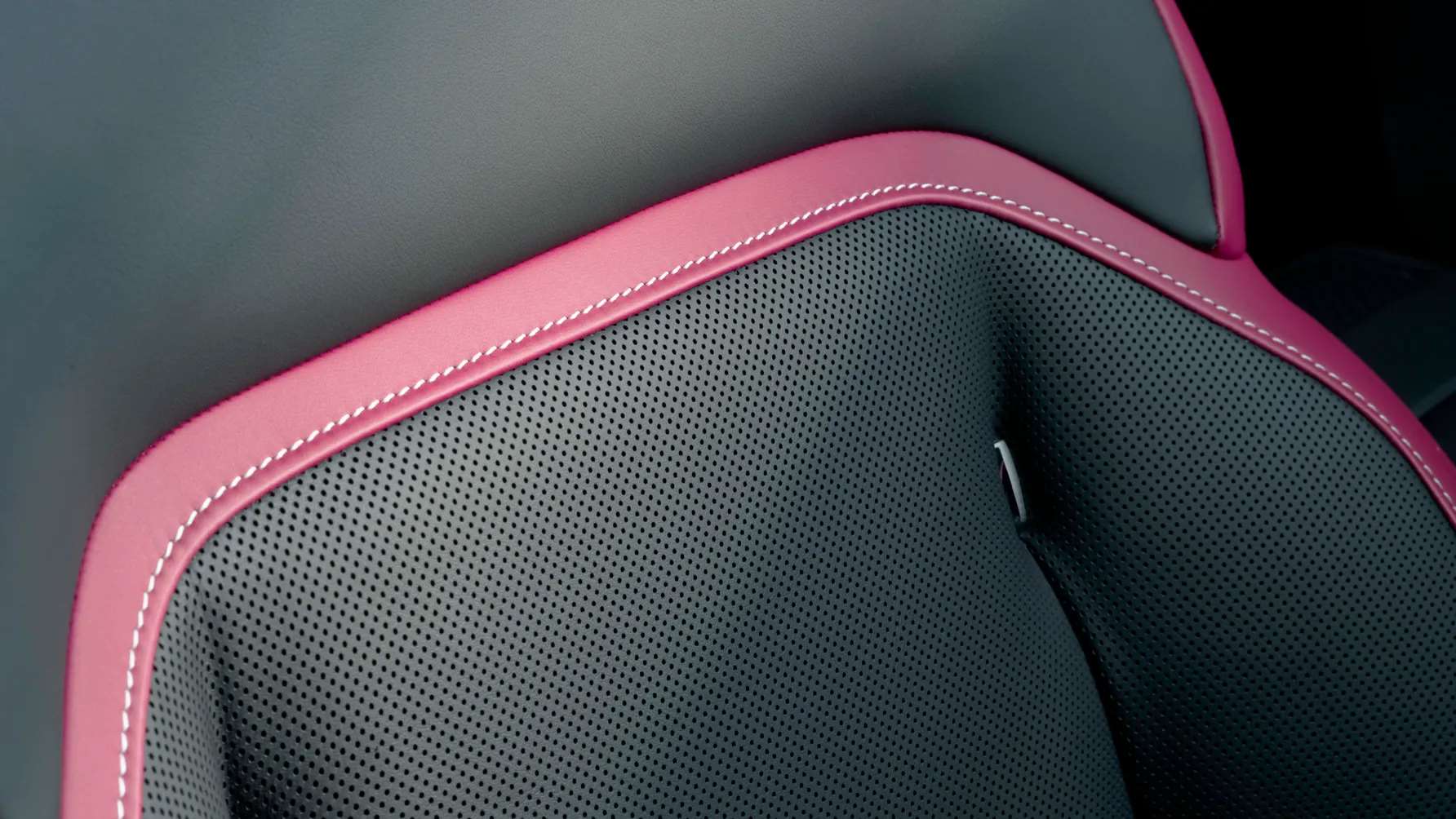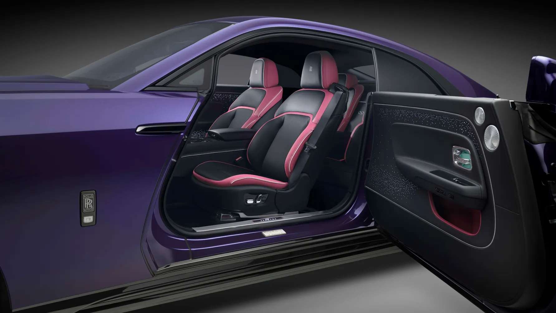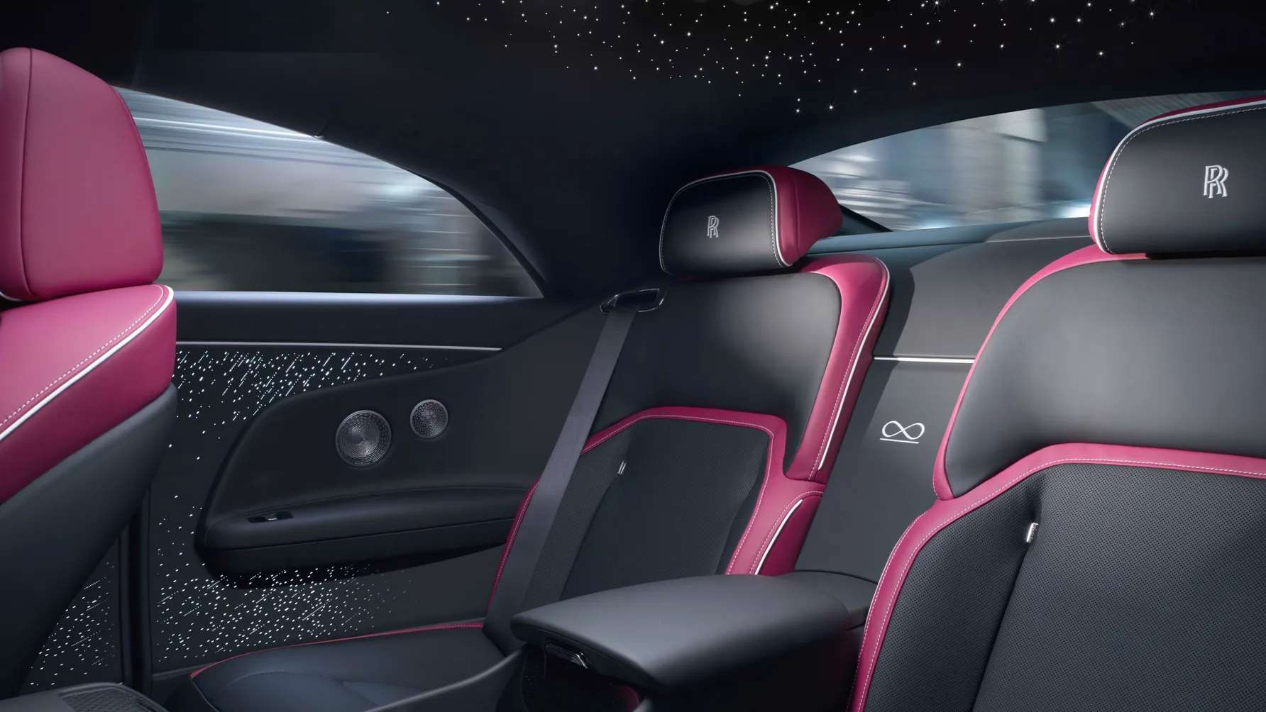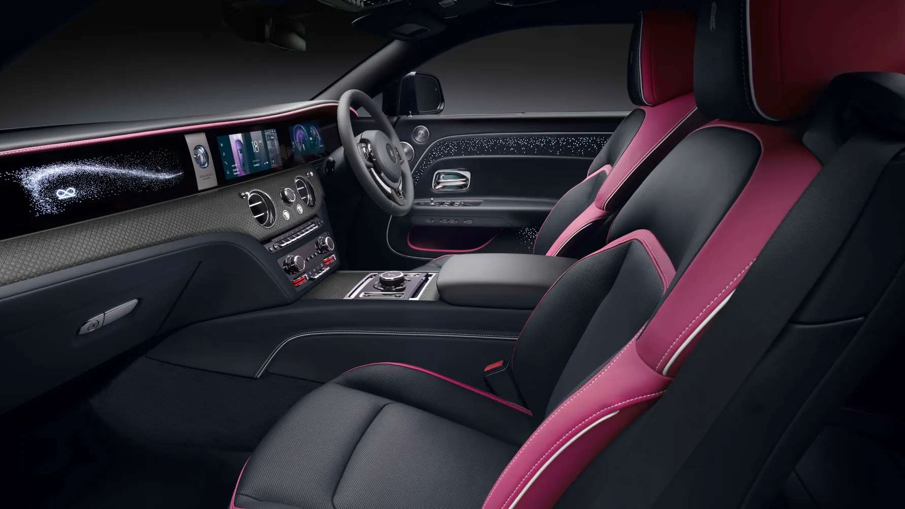 داخل السيارة، خليط مذهل من الجلد الزهري Peony Pink، وأجزاء من ألياف الكربون تضيف لمسة رياضية دون أن تضحّي بالفخامة. سقف السيارة يضم الإضاءة النجومية الشهيرة – عنصر لا غنى عنه لأي رولز رويس.