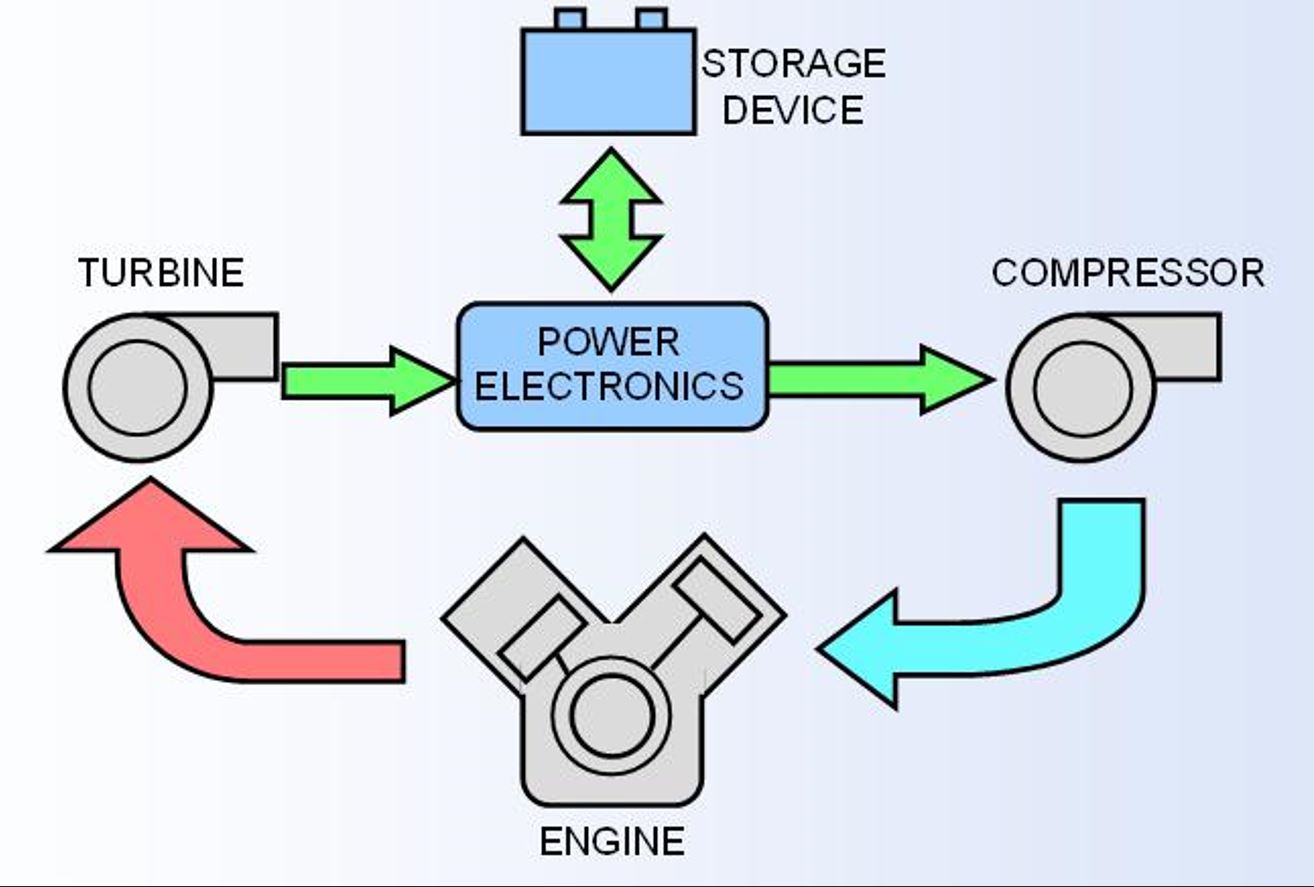 - إنتاج طاقة كهربائية عند الكبح: يمكن للمحرك الكهربائي أن يعمل بالعكس، ويولّد طاقة عند تقليل سرعة التيربو (تماماً مثل نظام كبح الطاقة في السيارات الهجينة).