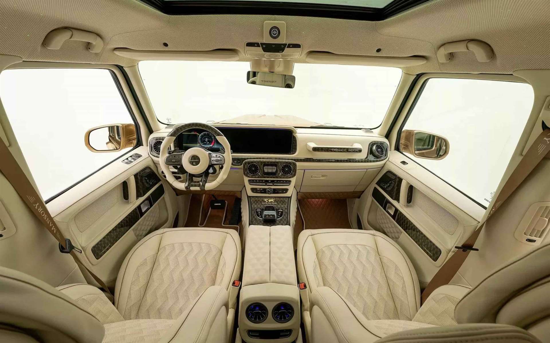 - مقصورة داخلية مُعاد تصميمها بالكامل: تتضمن ألياف كربونية مكشوفة، وجلد مُبطن بخياطة فاخرة بتصميم ألماسي، وكأنك تجلس في صالون طائرة خاصة.