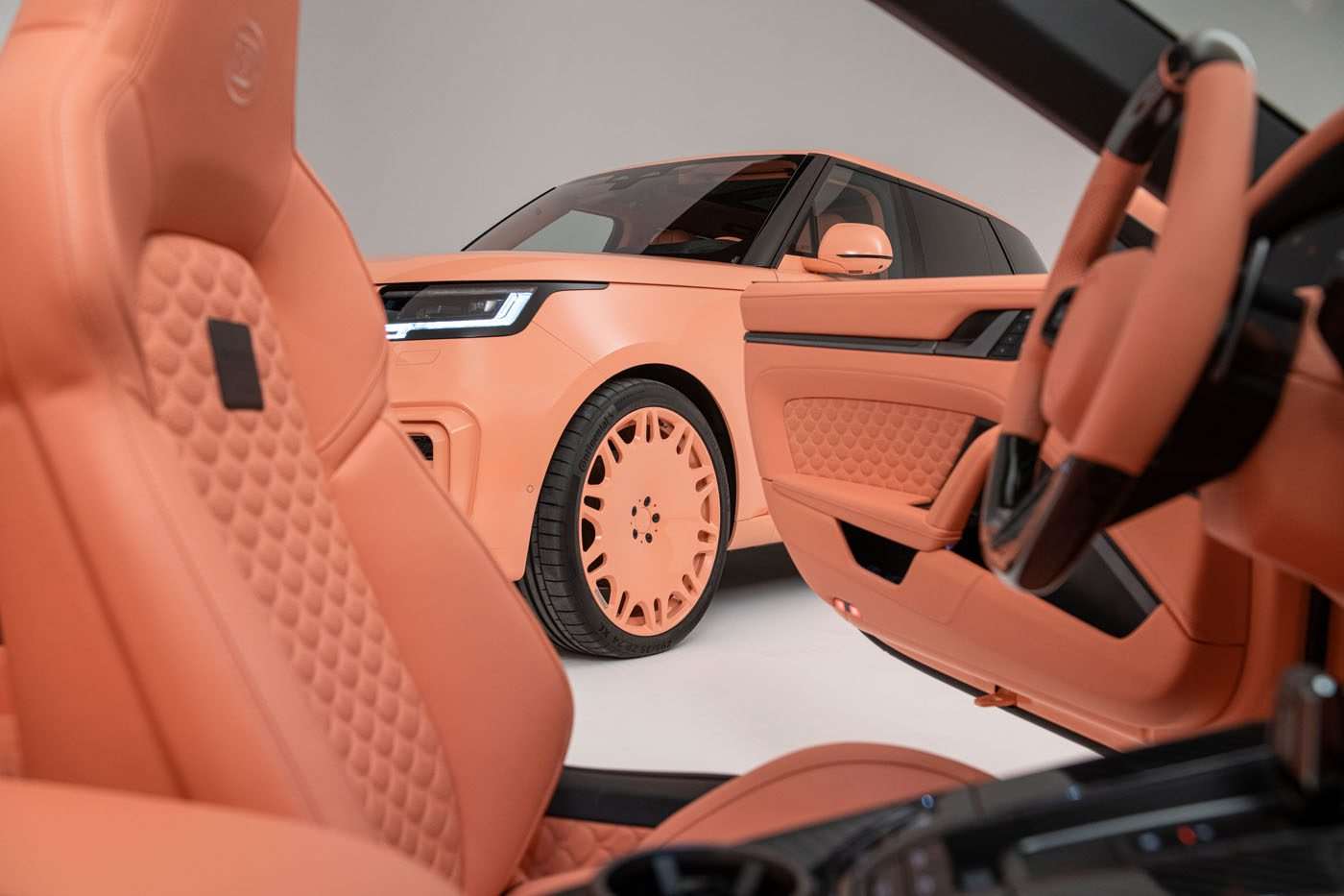 أما اللون الخوخي فيطغى على كل شيء: الهيكل، الجنوط المخصصة، وحتى الجلد الفاخر داخل المقصورة.